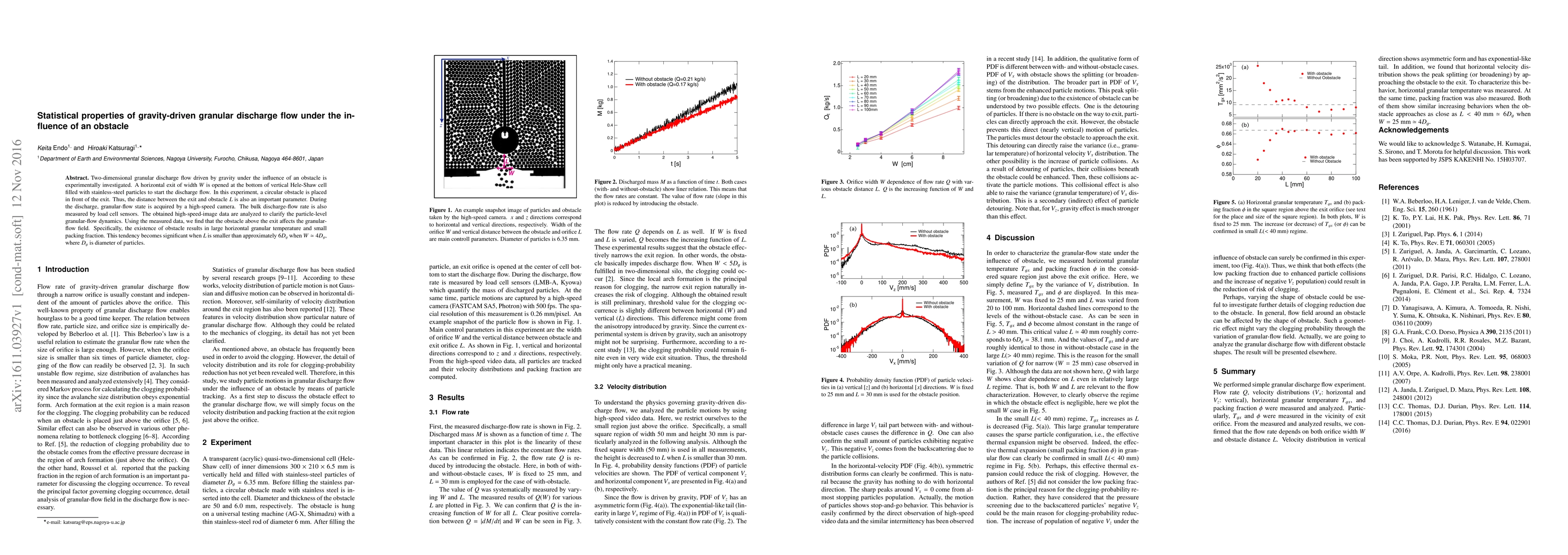 This study experimentally investigates the granular discharge flow driven by gravity in a Hele-Shaw cell with a circular obstacle. The results show that the obstacle significantly alters the granular flow, increasing horizontal granular temperature and reducing packing fraction, especially when the obstacle is closer than 6 times the particle diameter.