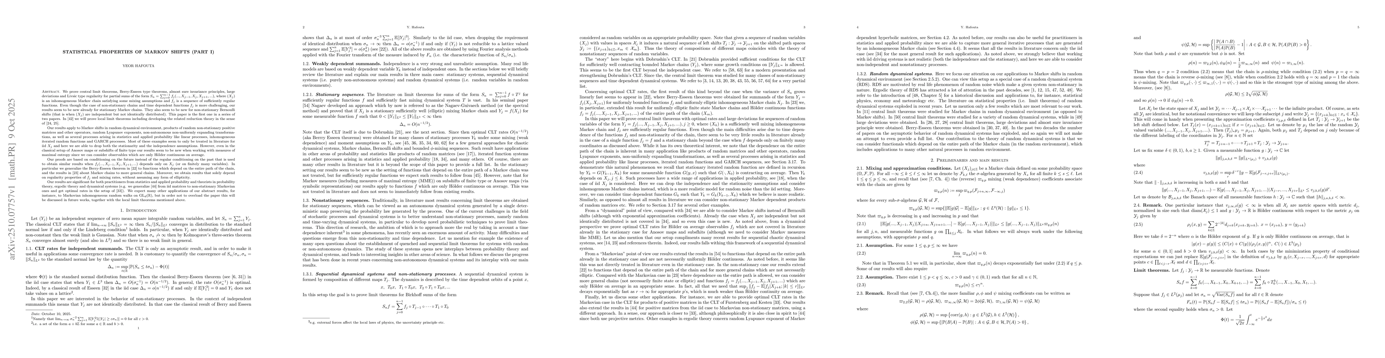 We prove central limit theorems, Berry-Esseen type theorems, almost sure invariance principles, large deviations and Livsic type regularity for partial sums of the form $S_n=\sum_{j=0}^{n-1}f_j(...,X_{j-1},X_j,X_{j+1},...)$, where $(X_j)$ is an inhomogeneous Markov chain satisfying some mixing assumptions and $f_j$ is a sequence of sufficiently regular functions. Even though the case of non-stationary chains and time dependent functions $f_j$ is more challenging, our results seem to be new already for stationary Markov chains. They also seem to be new for non-stationary Bernoulli shifts (that is when $(X_j)$ are independent but not identically distributed). This paper is the first one in a series of two papers. In \cite{Work} we will prove local limit theorems including developing the related reduction theory in the sense of \cite{DolgHaf LLT, DS}.