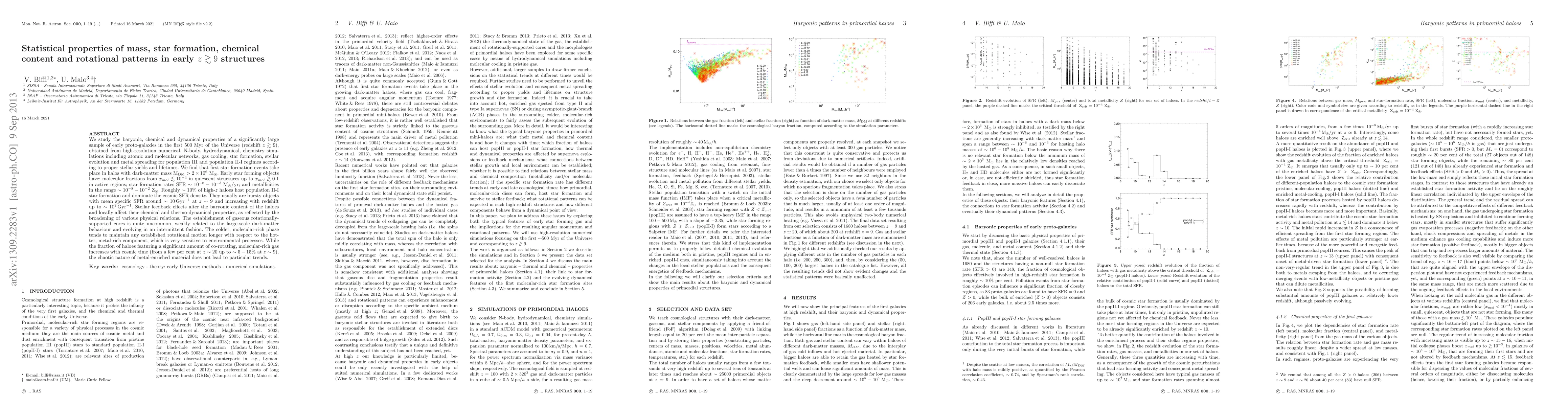 We study the baryonic, chemical and dynamical properties of a significantly large sample of early proto-galaxies in the first 500 Myr of the Universe (redshift z>9), obtained from high-resolution numerical, N-body, hydrodynamical, chemistry simulations including atomic and molecular networks, gas cooling, star formation, stellar evolution and metal spreading for population III and population II-I regimes according to proper stellar yields and lifetimes. We find that first star formation events take place in halos with dark-matter mass M_{DM} > 2\times 10^6 M_{sun}. Early star forming objects have: molecular fractions from x_{mol} < 10^{-4} in quiescent structures up to x_{mol} > 0.1 in active regions; star formation rates SFR ~10^{-8}-10^{-3}M_{sun}/yr; and metallicities in the range ~10^{-8}-10^{-2}Z_{sun}. Roughly ~10% of high-z haloes host population II-I star formation and dominate the cosmic SFR density. They usually are bursty objects with mean specific SFR around ~10 Gyr^{-1} at z~9 and increasing with redshift up to ~10^2 Gyr^{-1}. Stellar feedback effects alter the baryonic content of the haloes and locally affect their chemical and thermo-dynamical properties, as reflected by the broadening of various physical relations. The establishment of gaseous rotationally-supported cores is quite uncommon, weakly related to the large-scale dark-matter behaviour and evolving in an intermittent fashion. The colder, molecular-rich phase tends to maintain any established rotational motion longer with respect to the hotter, metal-rich component, which is very sensitive to environmental processes. While the fraction of haloes featuring a significant amount of co-rotating, molecular-rich gas increases with cosmic time (from a few percent at z~20 up to ~5-15% at z~9), the chaotic nature of metal-enriched material does not lead to particular trends.