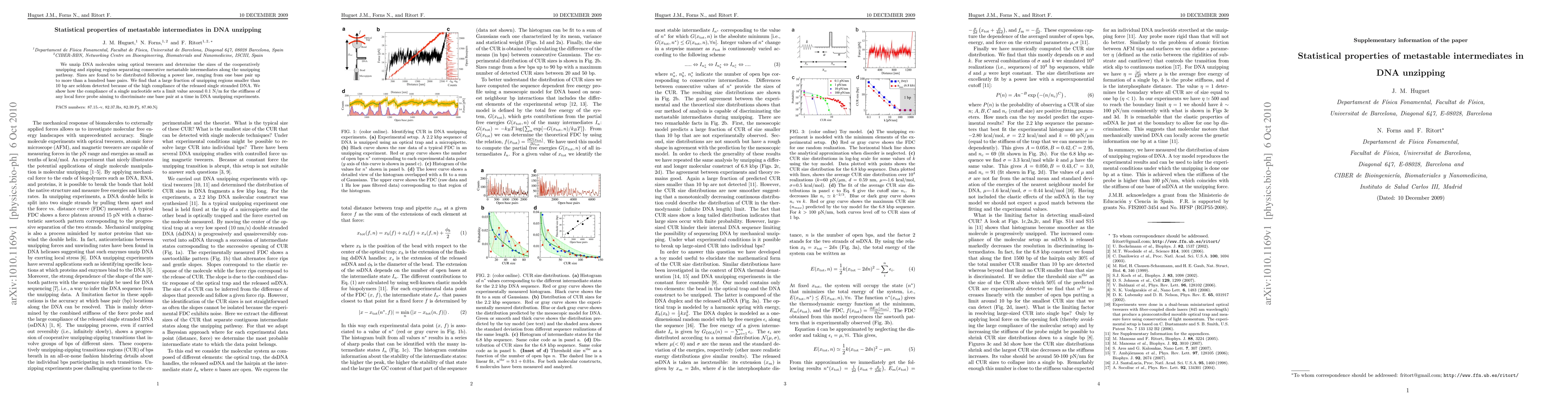 This paper investigates the statistical properties of metastable intermediates during DNA unzipping using optical tweezers, revealing that the sizes of unzipping and zipping regions follow a power law distribution. It also highlights the challenge of detecting small unzipping regions due to the high compliance of single-stranded DNA, setting a stiffness limit for local force probes.