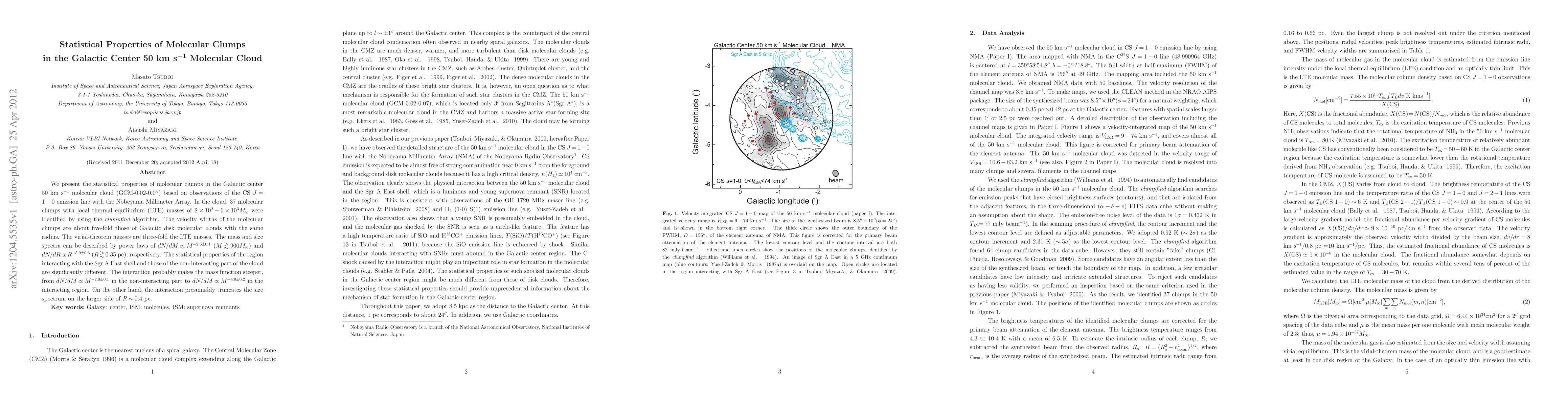 We present the statistical properties of molecular clumps in the Galactic center 50 km s$^{-1}$ molecular cloud (GCM-0.02-0.07) based on observations of the CS $J=1-0$ emission line with the Nobeyama Millimeter Array. In the cloud, 37 molecular clumps with local thermal equilibrium (LTE) masses of $2\times10^2-6\times10^3 M_\odot$ were identified by using the {\it clumpfind} algorithm. The velocity widths of the molecular clumps are about five-fold those of Galactic disk molecular clouds with the same radius. The virial-theorem masses are three-fold the LTE masses. The mass and size spectra can be described by power laws of $dN/dM\propto M^{-2.6\pm0.1}$ ($M\gtrsim 900M_\odot$) and $dN/dR\propto R^{-5.9\pm0.3}$ ($R\gtrsim 0.35$ pc), respectively. The statistical properties of the region interacting with the Sgr A East shell and those of the non-interacting part of the cloud are significantly different. The interaction probably makes the mass function steeper, from $dN/dM\propto M^{-2.0\pm0.1}$ in the non-interacting part to $dN/dM\propto M^{-4.0\pm0.2}$ in the interacting region. On the other hand, the interaction presumably truncates the size spectrum on the larger side of $R\sim 0.4$ pc.