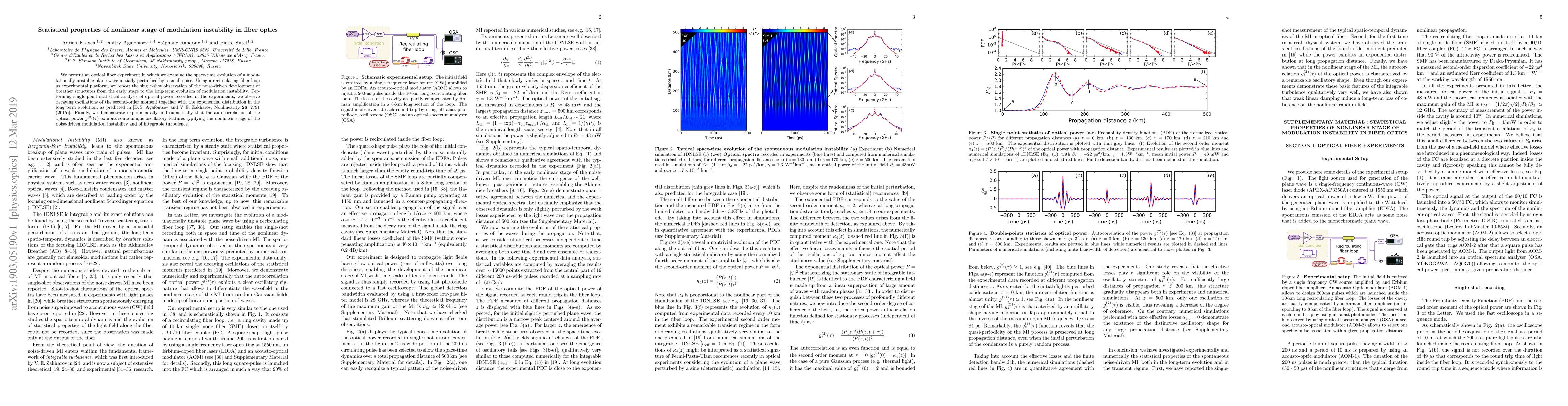 We present an optical fiber experiment in which we examine the space-time evolution of a modulationally unstable plane wave initially perturbed by a small noise. Using a recirculating fiber loop as experimental platform, we report the single-shot observation of the noise-driven development of breather structures from the early stage to the long-term evolution of modulation instability. Performing single-point statistical analysis of optical power recorded in the experiments, we observe decaying oscillations of the second-order moment together with the exponential distribution in the long term evolution, as predicted in [D.\,S. Agafontsev and V.\,E. Zakharov, Nonlinearity {\bf 28}, 2791 (2015)]. Finally, we demonstrate experimentally and numerically that the autocorrelation of the optical power $g^{(2)}(\tau)$ exhibits some unique oscillatory features typifying the nonlinear stage of the noise-driven modulation instability and of integrable turbulence
