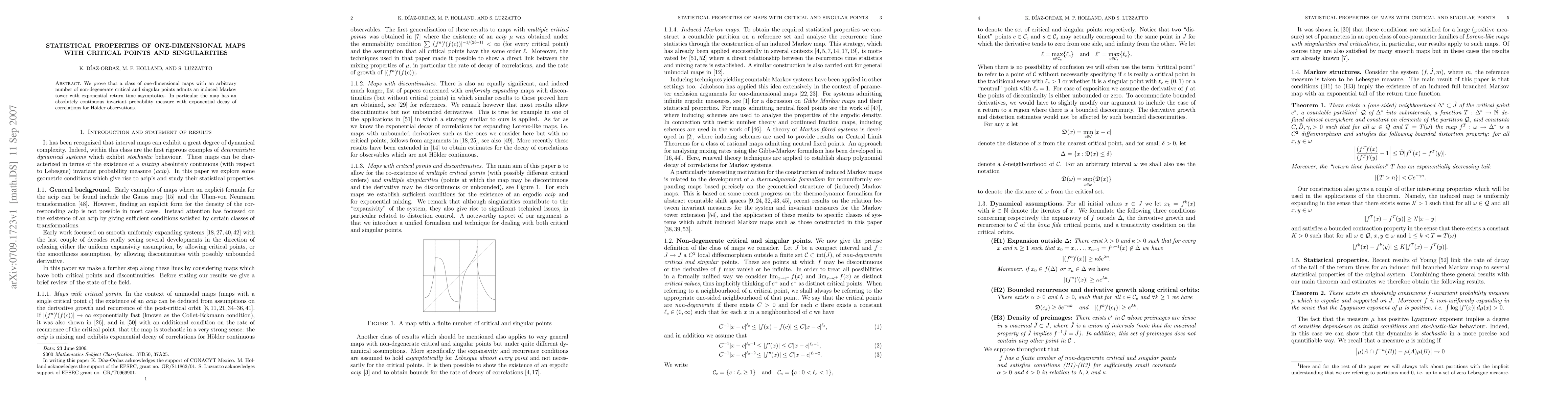 This paper demonstrates that one-dimensional maps with multiple critical and singular points exhibit an induced Markov tower structure with exponential return time. It also shows the existence of an absolutely continuous invariant probability measure with exponential decay of correlations for Hölder observations.