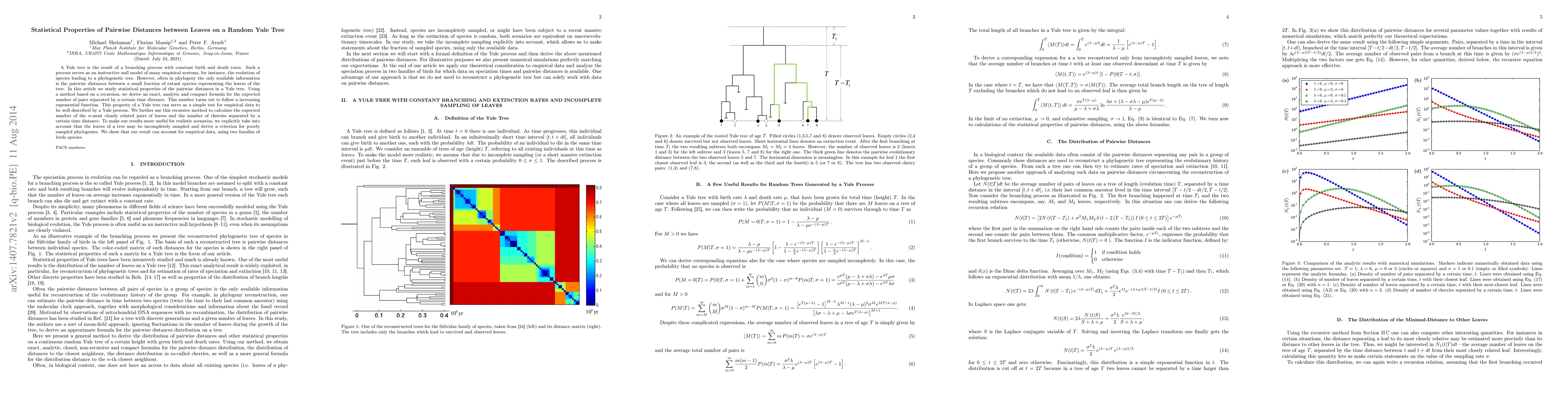 This paper examines statistical properties of pairwise distances between leaves on a Yule tree, a branching process model used to represent evolutionary trees. It derives an exact formula for the expected number of pairs separated by a certain time distance, which follows an increasing exponential function, offering a test for data fitting a Yule process.