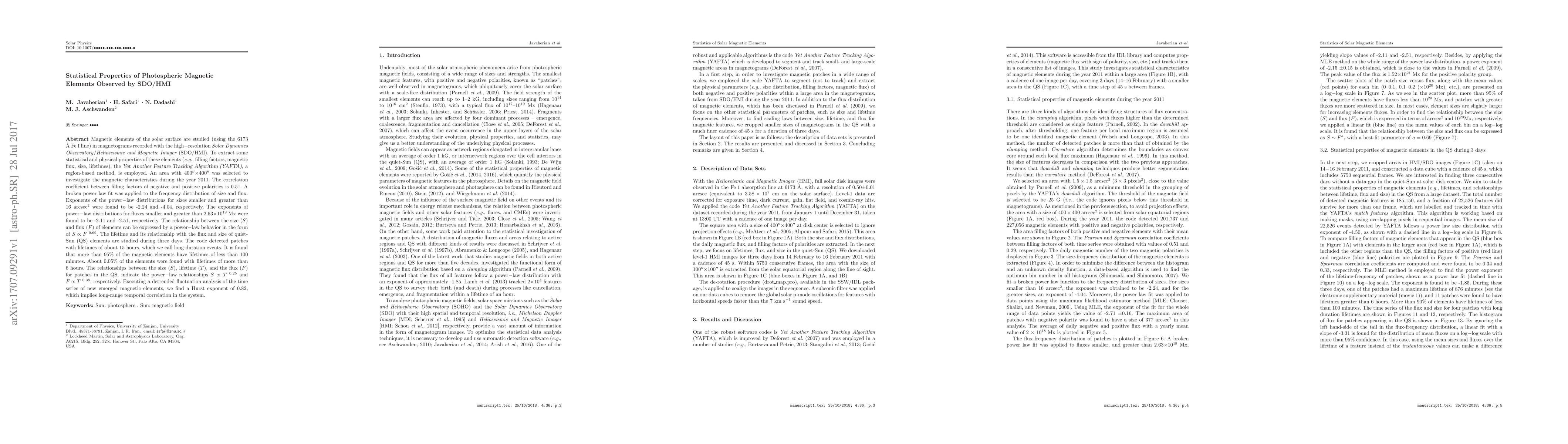 A study of solar magnetic elements reveals statistical properties such as filling factors, magnetic flux, size, and lifetimes, with power-law relationships between size and flux and long-range temporal correlation in the system.