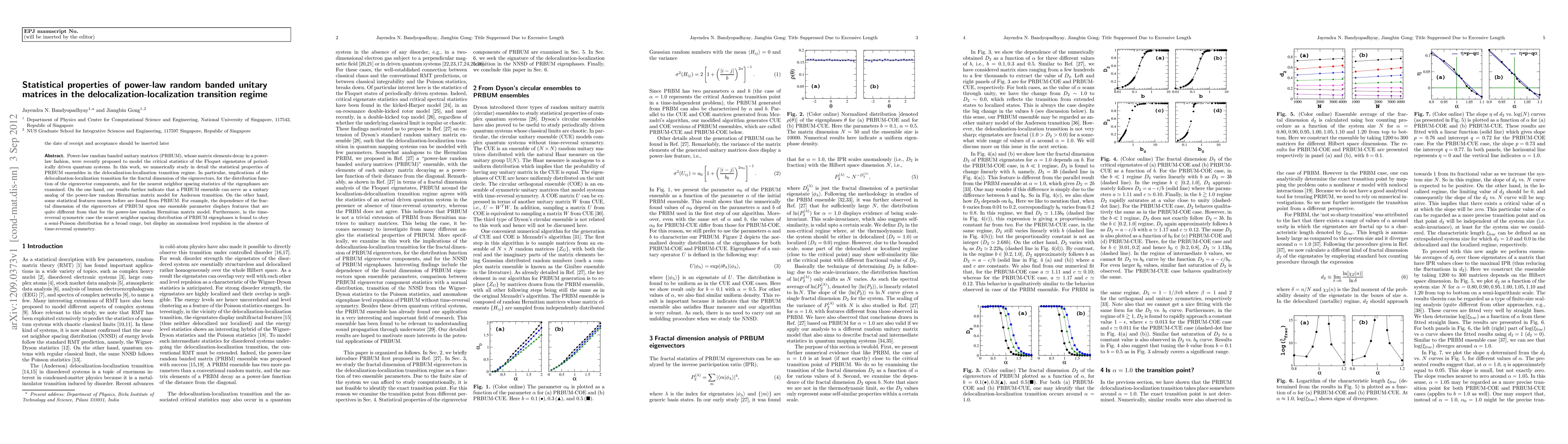 Detailed numerical analysis of power-law random banded unitary matrices (PRBUM) in the delocalization-localization transition regime, examining fractal dimensions, eigenvector component distributions, and nearest neighbor spacing statistics.