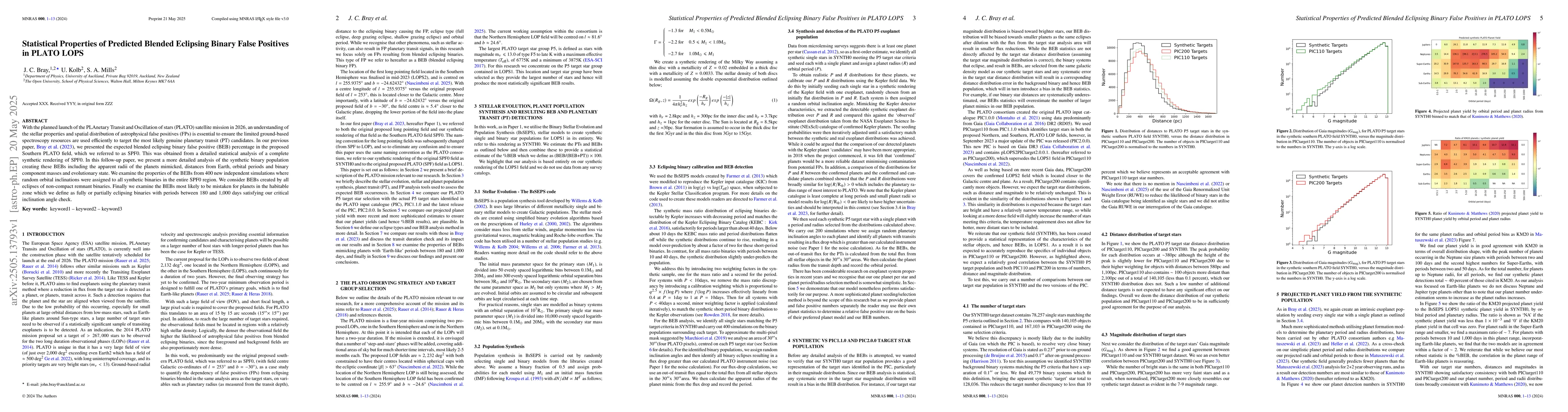 The research uses a detailed statistical analysis of a complete synthetic rendering of the Southern PLATO field (SPF0) to examine the properties of blended eclipsing binary false positives (BEBs). This includes 400 new independent simulations with random orbital inclinations assigned to all synthetic binaries in the SPF0 region, focusing on eclipses of non-compact remnant binaries.