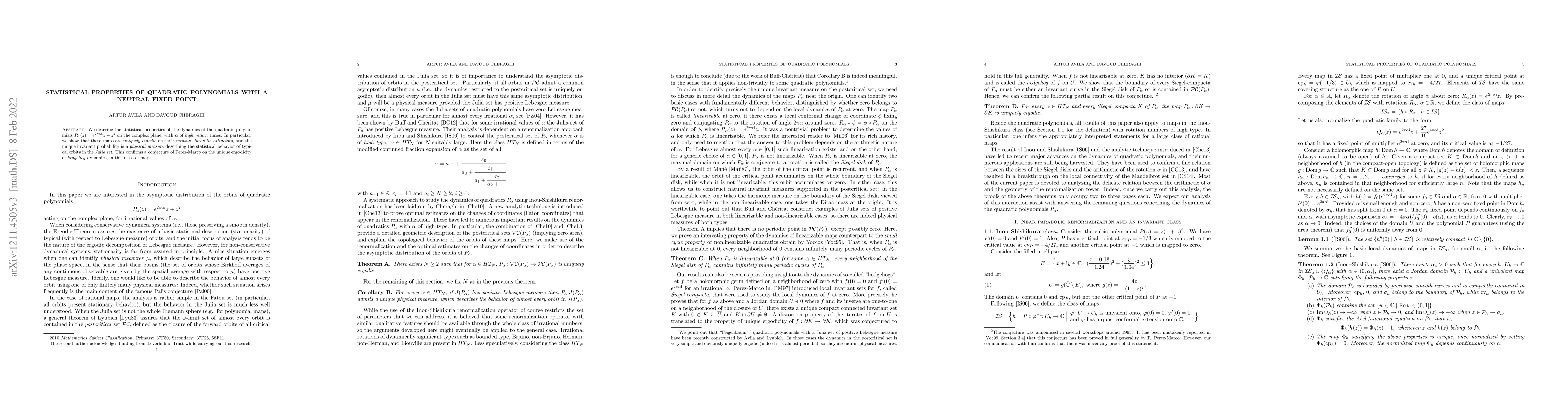 This research paper explores the statistical properties of quadratic polynomials with a neutral fixed point, showing they are uniquely ergodic on their attractors and exhibit unique invariant probabilities that describe typical orbits.