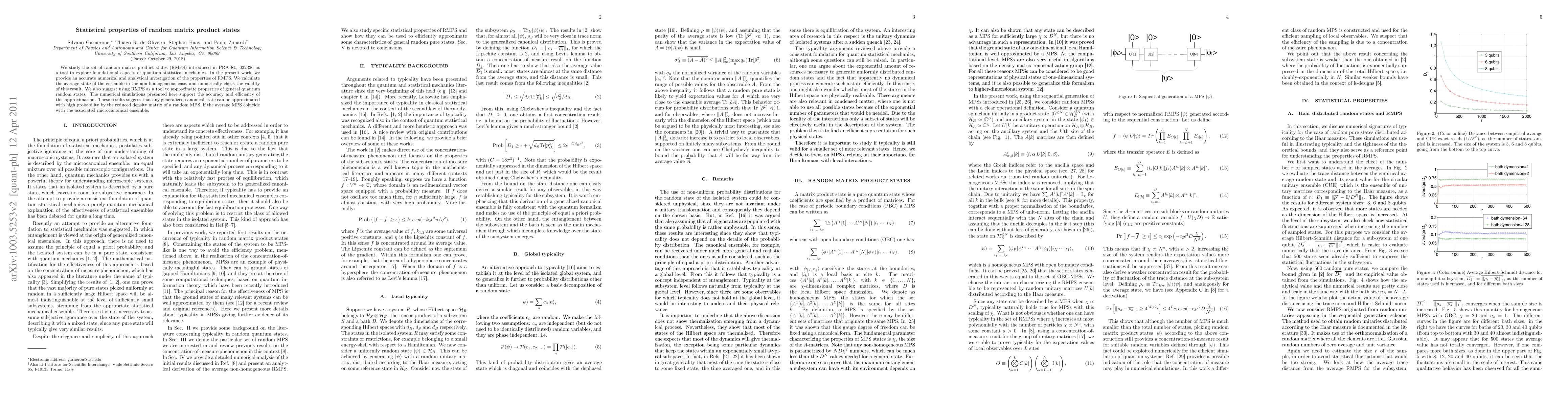This paper investigates the statistical properties of random matrix product states (RMPS) to explore foundational aspects of quantum statistical mechanics. The authors provide numerical and analytical insights into the average state of RMPS ensembles and validate their findings, suggesting RMPS can effectively approximate properties of general quantum random states.