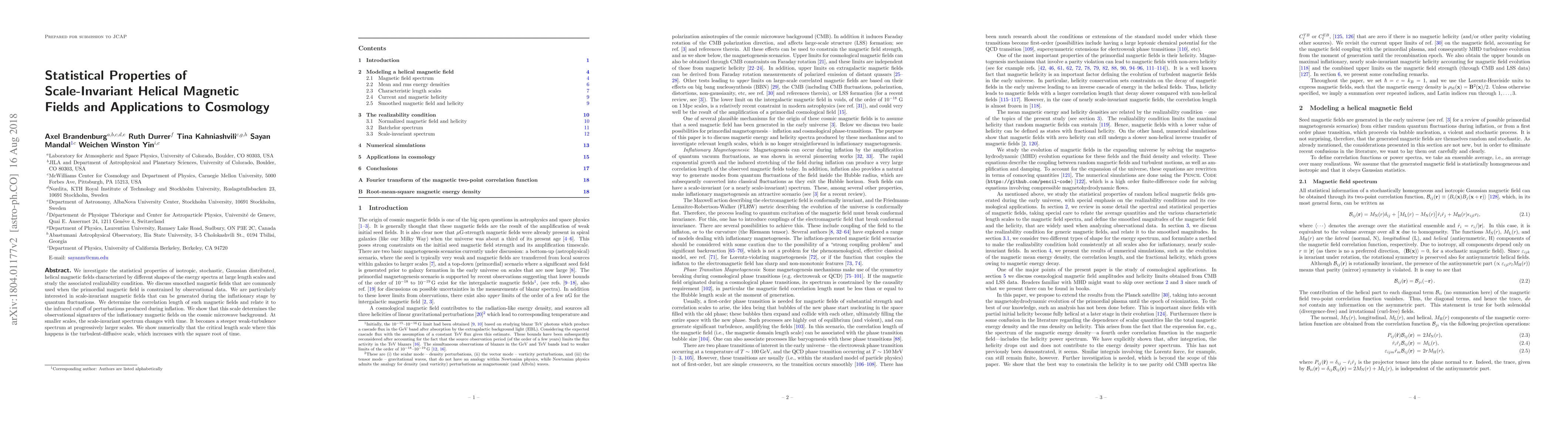 This paper explores the statistical properties of helical magnetic fields, focusing on their scale-invariant nature and realizability conditions, particularly during the inflationary stage. It determines the correlation length of these fields and links it to observational signatures on the cosmic microwave background.