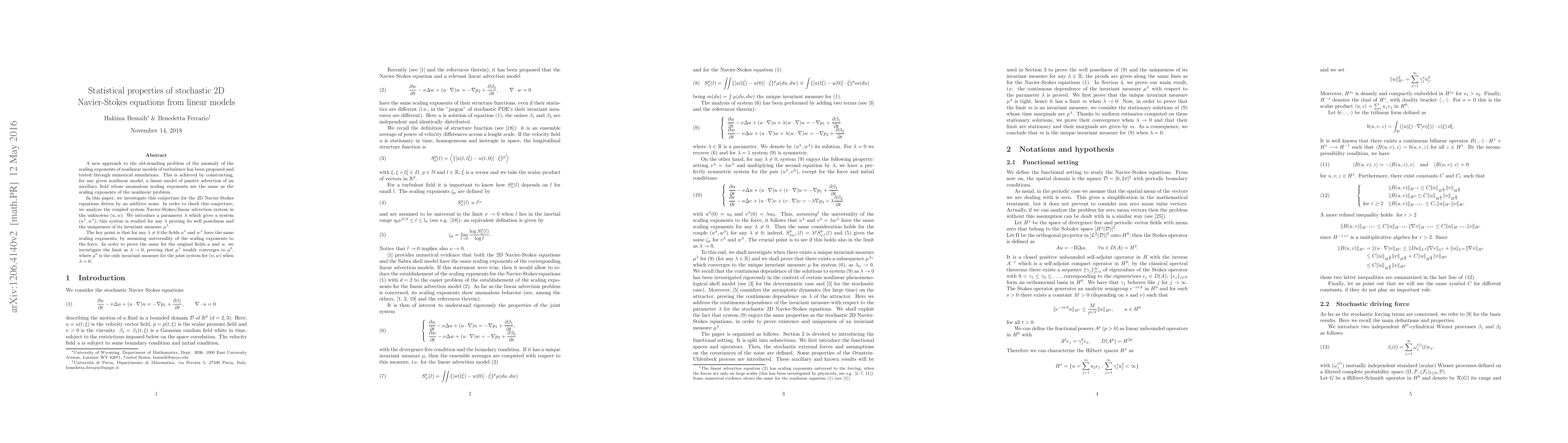 A new approach to the old-standing problem of the anomaly of the scaling exponents of nonlinear models of turbulence has been proposed and tested through numerical simulations. This is achieved by constructing, for any given nonlinear model, a linear model of passive advection of an auxiliary field whose anomalous scaling exponents are the same as the scaling exponents of the nonlinear problem. In this paper, we investigate this conjecture for the 2D Navier-Stokes equations driven by an additive noise. In order to check this conjecture, we analyze the coupled system Navier-Stokes/linear advection system in the unknowns $(u,w)$. We introduce a parameter $\lambda$ which gives a system $(u^\lambda,w^\lambda)$; this system is studied for any $\lambda$ proving its well posedness and the uniqueness of its invariant measure $\mu^\lambda$. The key point is that for any $\lambda \neq 0$ the fields $u^\lambda$ and $w^\lambda$ have the same scaling exponents, by assuming universality of the scaling exponents to the force. In order to prove the same for the original fields $u$ and $w$, we investigate the limit as $\lambda \to 0$, proving that $\mu^\lambda$ weakly converges to $\mu^0$, where $\mu^0$ is the only invariant measure for the joint system for $(u,w)$ when $\lambda=0$.
