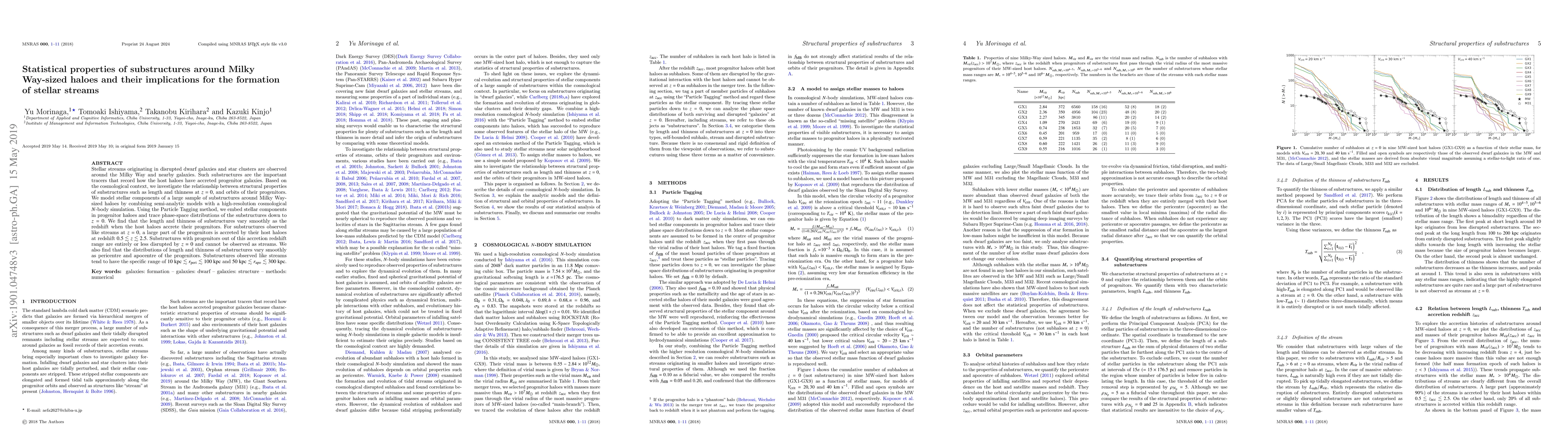 This paper investigates the statistical properties of substructures around Milky Way-sized haloes, finding that the length and thinness of stellar streams vary with accretion redshift and progenitor orbits. Substructures observed as streams are typically accreted at $0.5\lesssim z\lesssim 2.5$, with progenitors having pericenters between $10\ {\rm kpc}$ and $100\ {\rm kpc}$ and apocenters between $50\ {\rm kpc}$ and $300\ {\rm kpc}$.