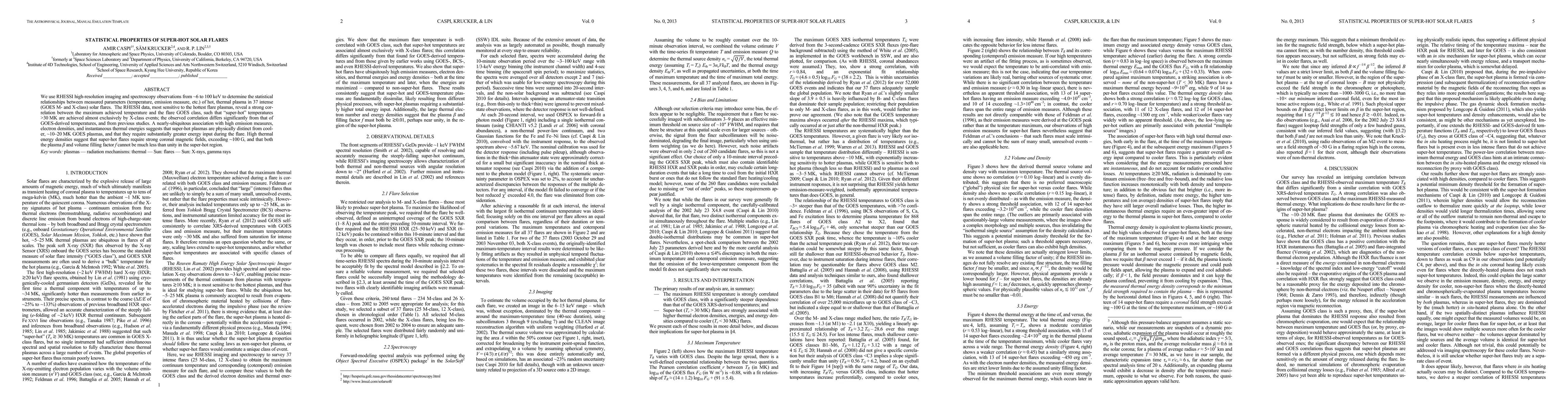 We use RHESSI high-resolution imaging and spectroscopy observations from ~6 to 100 keV to determine the statistical relationships between measured parameters (temperature, emission measure, etc.) of hot, thermal plasma in 37 intense (GOES M- and X-class) solar flares. The RHESSI data, most sensitive to the hottest flare plasmas, reveal a strong correlation between the maximum achieved temperature and the flare GOES class, such that "super-hot" temperatures >30 MK are achieved almost exclusively by X-class events; the observed correlation differs significantly from that of GOES-derived temperatures, and from previous studies. A nearly-ubiquitous association with high emission measures, electron densities, and instantaneous thermal energies suggests that super-hot plasmas are physically distinct from cooler, ~10-20 MK GOES plasmas, and that they require substantially greater energy input during the flare. High thermal energy densities suggest that super-hot flares require strong coronal magnetic fields, exceeding ~100 G, and that both the plasma {\beta} and volume filling factor f cannot be much less than unity in the super-hot region.