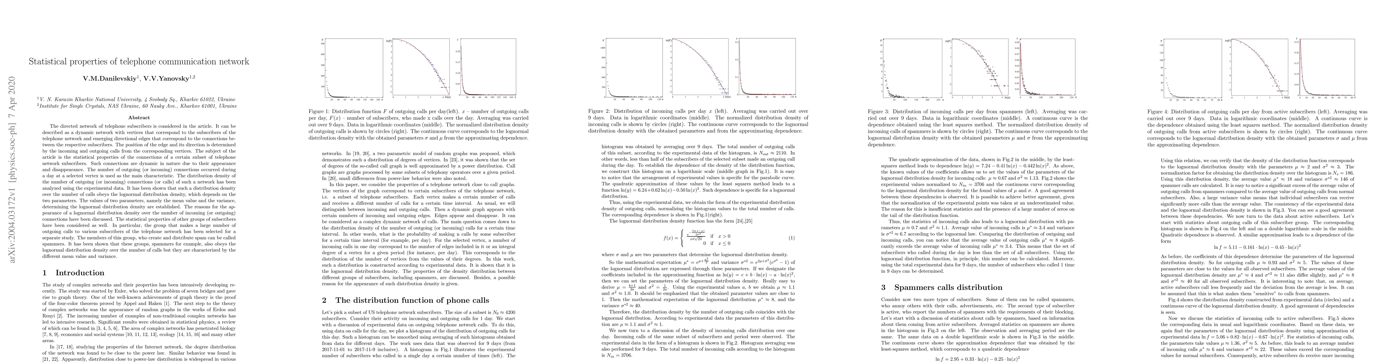 This paper investigates the statistical properties of telephone communication networks, focusing on the dynamic nature of connections between subscribers. It finds that the distribution density of the number of outgoing calls follows a lognormal distribution, characterized by mean and variance parameters, and discusses the reasons for this distribution, including the behavior of spammers who exhibit different lognormal characteristics.
