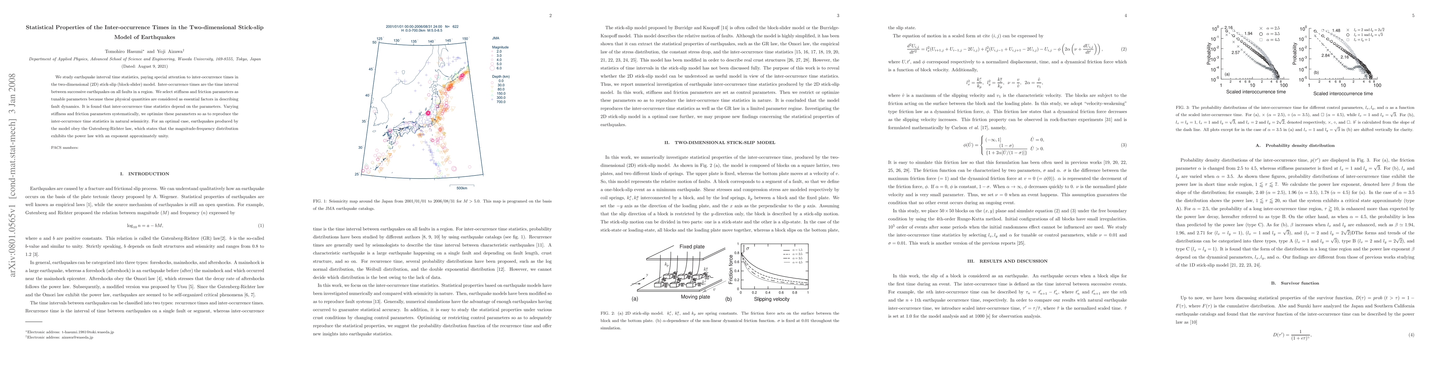 This paper investigates the statistical properties of inter-occurrence times in a two-dimensional stick-slip model of earthquakes, finding that these times depend on stiffness and friction parameters. The study optimizes these parameters to match natural seismicity, showing that the model can reproduce the Gutenberg-Richter law for earthquake magnitude-frequency distribution.