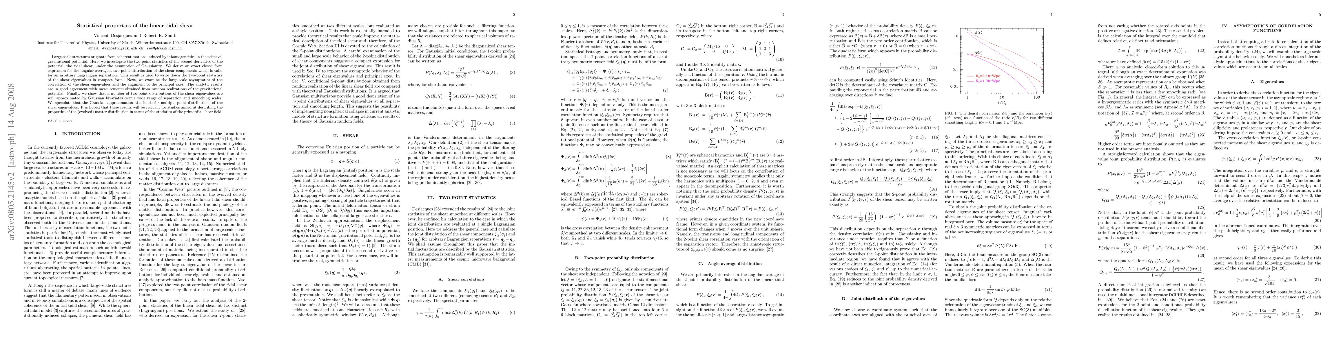 Large-scale structures originate from coherent motions induced by inhomogeneities in the primeval gravitational potential. Here, we investigate the two-point statistics of the second derivative of the potential, the tidal shear, under the assumption of Gaussianity. We derive an exact closed form expression for the angular averaged, two-point distribution of the shear components which is valid for an arbitrary Lagrangian separation. This result is used to write down the two-point statistics of the shear eigenvalues in compact form. Next, we examine the large-scale asymptotics of the correlation of the shear eigenvalues, and the alignment of the principal axes. The analytic results are in good agreement with measurements obtained from random realizations of the gravitational potential. Finally, we show that a number of two-point distributions of the shear eigenvalues are well approximated by Gaussian bivariates over a wide range of separation and smoothing scales. We speculate that the Gaussian approximation also holds for multiple point distributions of the shear eigenvalues. It is hoped that these results will be relevant for studies aimed at describing the properties of the (evolved) matter distribution in terms of the statistics of the primordial shear field.