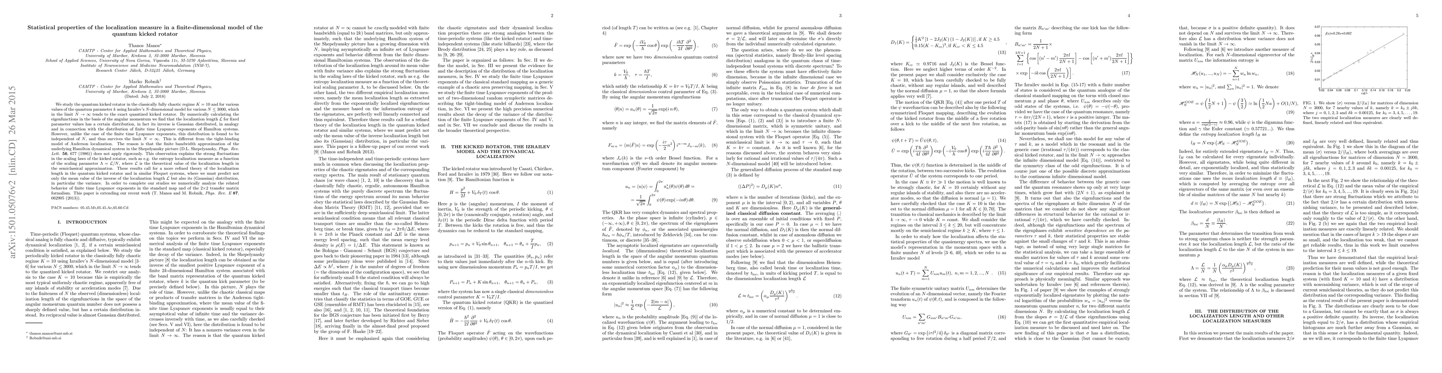 This paper investigates the statistical properties of the localization measure in a finite-dimensional quantum kicked rotator model, finding that the inverse localization length follows a Gaussian distribution independent of the system size $N$. The study highlights the need for a refined theory to predict both the mean and distribution (including variance) of localization length in such quantum systems.