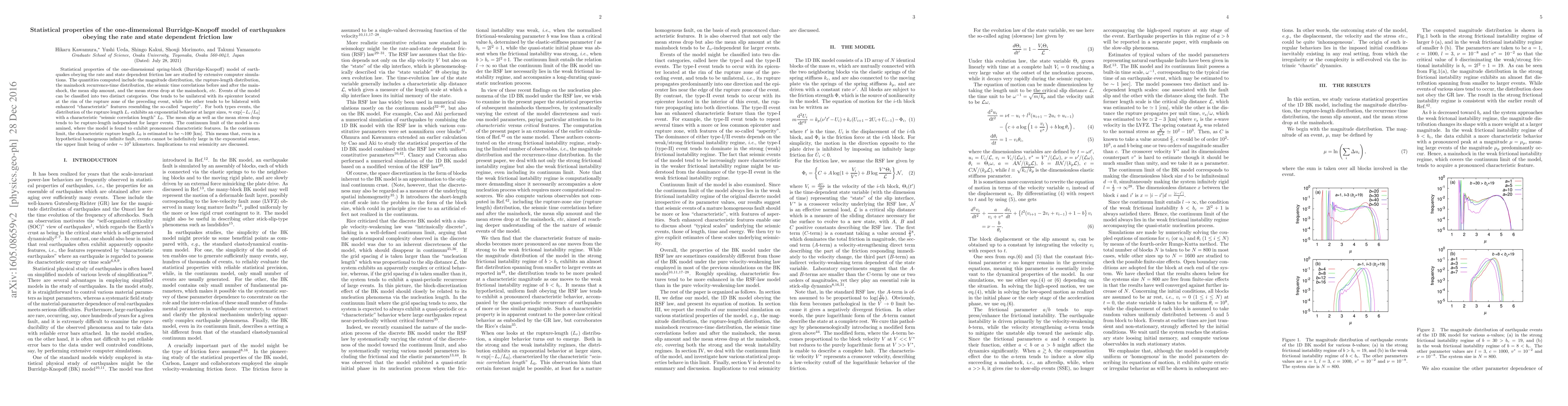 This paper studies the statistical properties of the one-dimensional Burridge-Knopoff earthquake model using computer simulations, revealing distinct unilateral and bilateral event types with an exponential rupture-length distribution. The study finds that mean slip and stress drop are rupture-length independent for large events, and estimates a characteristic seismic correlation length of ~100 km in the continuum limit.