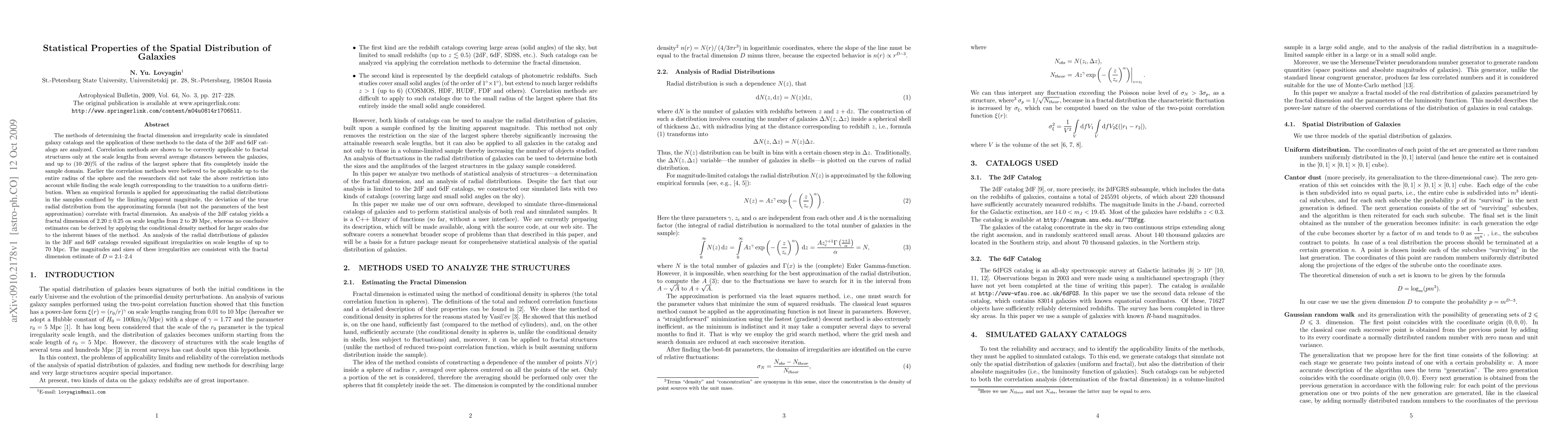 The methods of determining the fractal dimension and irregularity scale in simulated galaxy catalogs and the application of these methods to the data of the 2dF and 6dF catalogs are analyzed. Correlation methods are shown to be correctly applicable to fractal structures only at the scale lengths from several average distances between the galaxies, and up to (10-20)% of the radius of the largest sphere that fits completely inside the sample domain. Earlier the correlation methods were believed to be applicable up to the entire radius of the sphere and the researchers did not take the above restriction into account while finding the scale length corresponding to the transition to a uniform distribution. When an empirical formula is applied for approximating the radial distributions in the samples confined by the limiting apparent magnitude, the deviation of the true radial distribution from the approximating formula (but not the parameters of the best approximation) correlate with fractal dimension. An analysis of the 2dF catalog yields a fractal dimension of 2.20 +-m 0.25 on scale lengths from 2 to 20 Mpc, whereas no conclusive estimates can be derived by applying the conditional density method for larger scales due to the inherent biases of the method. An analysis of the radial distributions of galaxies in the 2dF and 6dF catalogs revealed significant irregularities on scale lengths of up to 70 Mpc. The magnitudes and sizes of these irregularities are consistent with the fractal dimension estimate of D = 2.1-2.4