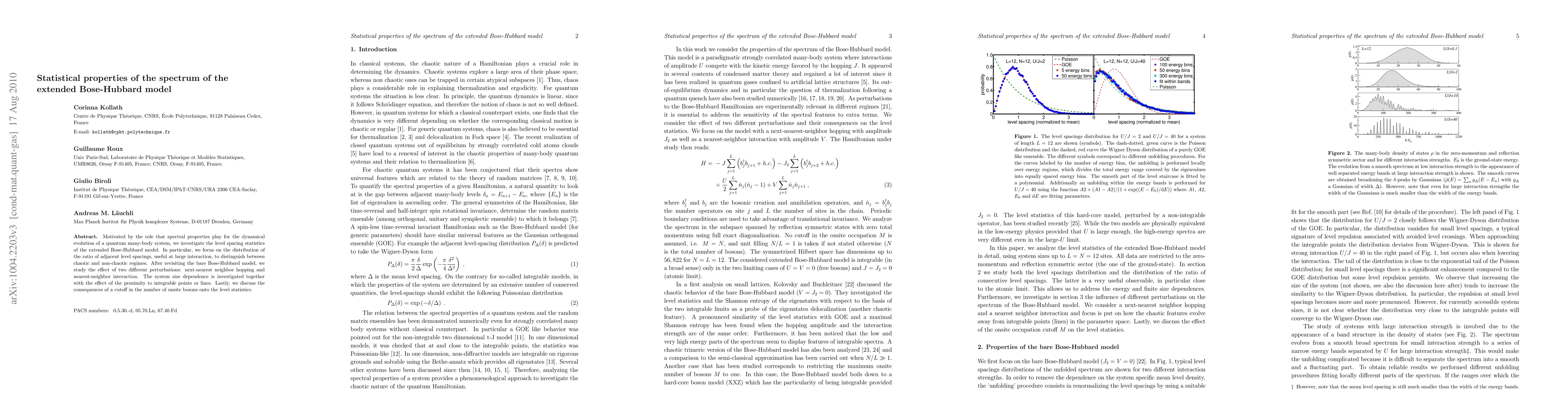 This paper examines the spectral properties of the extended Bose-Hubbard model, focusing on level spacing statistics to distinguish between chaotic and non-chaotic regimes. The study investigates perturbations like next-nearest neighbor hopping and nearest-neighbor interaction, analyzing system size dependence and the impact of proximity to integrable points.