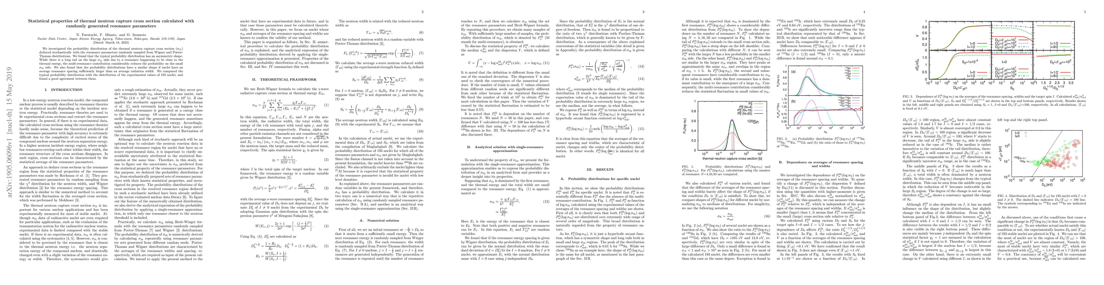 This study explores the statistical properties of thermal neutron capture cross sections derived from randomly generated resonance parameters, revealing an asymmetric probability distribution with a long tail on the high cross-section side. The research confirms that the probability distributions align well with experimental data for nuclei with larger resonance spacings relative to radiation widths.