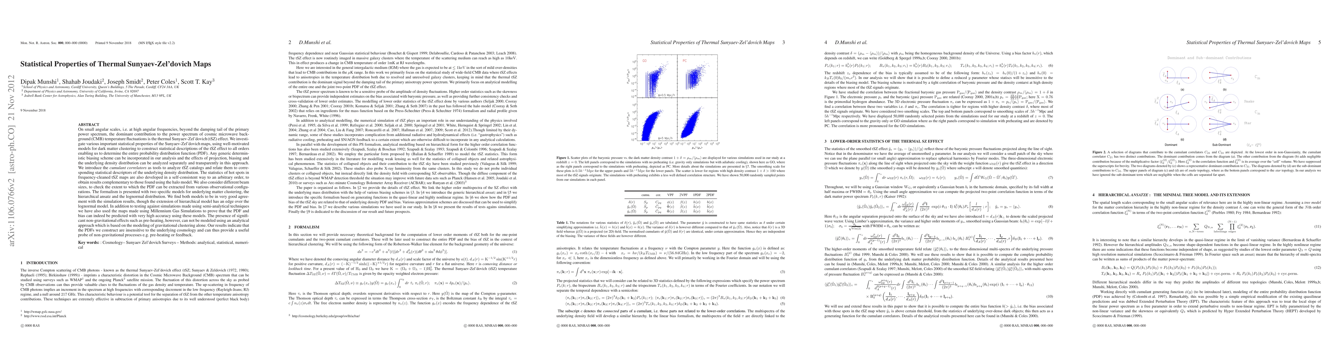This paper investigates statistical properties of thermal Sunyaev-Zel'dovich (tSZ) maps, determining the probability distribution function (PDF) and analyzing effects of projection, biasing, and density distribution. It introduces cumulant correlators and develops statistics for hot spots, comparing two models for matter clustering: hierarchical ansatz and lognormal distribution, with the latter showing better agreement with simulations.