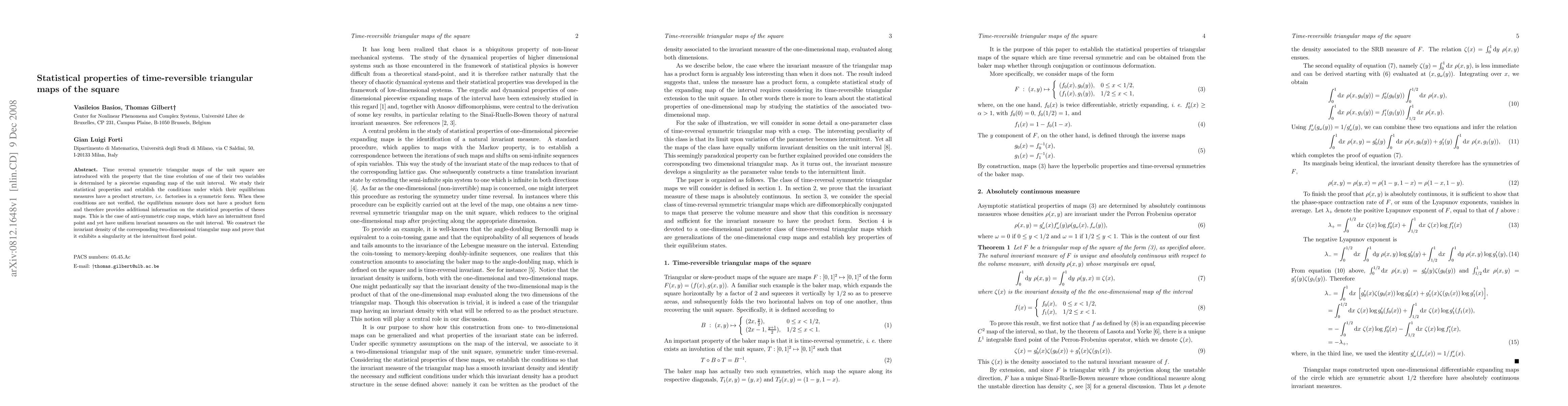 This research introduces time-reversible triangular maps of the square, analyzing their statistical properties. It establishes conditions for equilibrium measures to have a product structure, and explores cases where they don't, like anti-symmetric cusp maps. These maps, despite having an intermittent fixed point, show uniform invariant measures on the unit interval. The paper constructs the invariant density of the corresponding two-dimensional triangular map, proving a singularity at the intermittent fixed point.