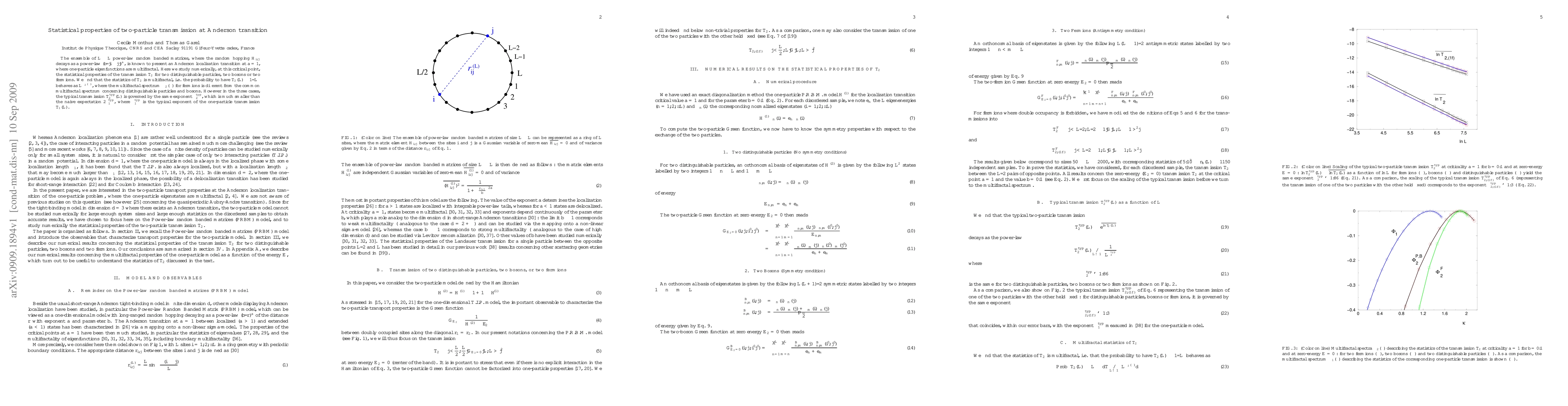 This paper investigates the statistical properties of two-particle transmission at the Anderson localization transition in power-law random banded matrices. It finds that the transmission statistics for two particles, whether distinguishable or bosons/fermions, exhibit multifractal behavior, with distinct multifractal spectra for fermions compared to distinguishable particles and bosons, though all share the same typical transmission exponent.