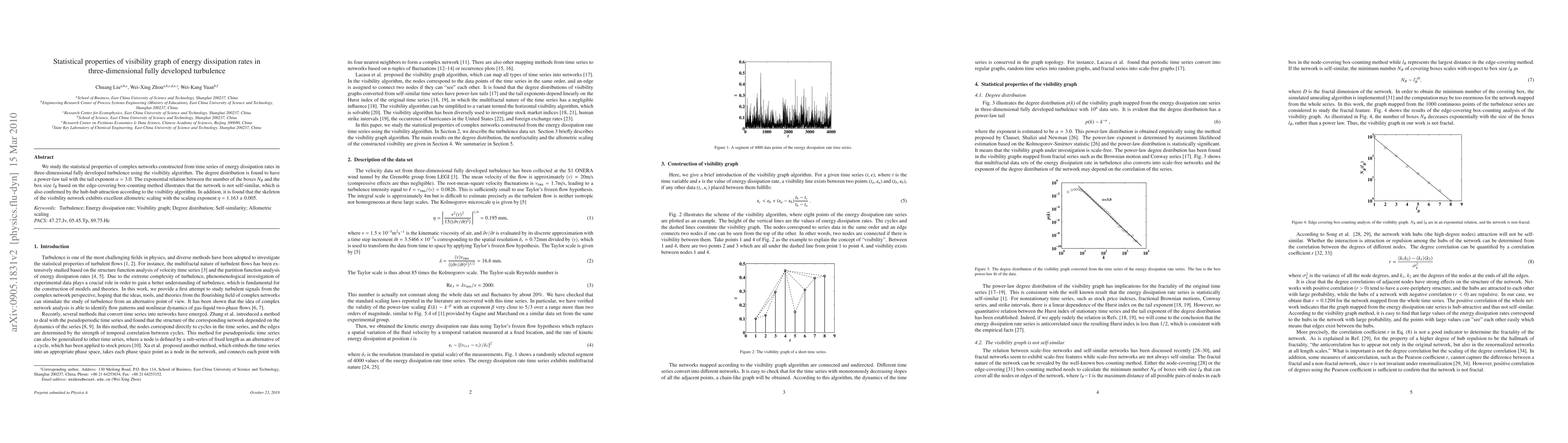 This paper investigates the statistical properties of a network derived from energy dissipation rates in three-dimensional turbulence using the visibility graph algorithm. The network's degree distribution follows a power-law with an exponent of 3.0, and it lacks self-similarity, as evidenced by its non-exponential box-counting method relationship and hub-hub attraction. The skeleton of the network shows allometric scaling with an exponent of 1.163±0.005.