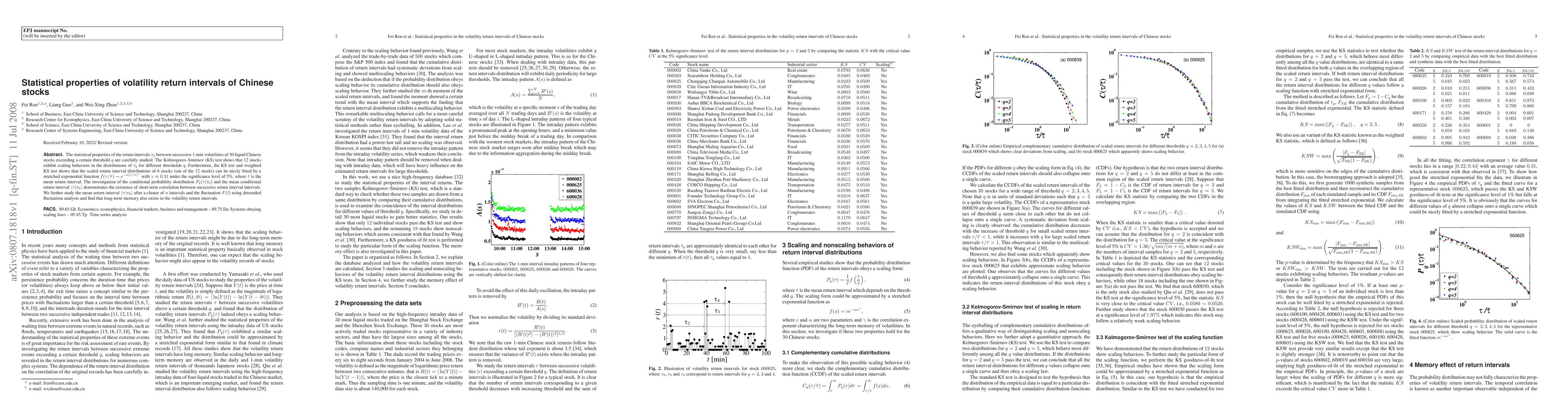 The statistical properties of the return intervals $\tau_q$ between successive 1-min volatilities of 30 liquid Chinese stocks exceeding a certain threshold $q$ are carefully studied. The Kolmogorov-Smirnov (KS) test shows that 12 stocks exhibit scaling behaviors in the distributions of $\tau_q$ for different thresholds $q$. Furthermore, the KS test and weighted KS test shows that the scaled return interval distributions of 6 stocks (out of the 12 stocks) can be nicely fitted by a stretched exponential function $f(\tau/\bar{\tau})\sim e^{- \alpha (\tau/\bar{\tau})^{\gamma}}$ with $\gamma\approx0.31$ under the significance level of 5%, where $\bar{\tau}$ is the mean return interval. The investigation of the conditional probability distribution $P_q(\tau | \tau_0)$ and the mean conditional return interval $<\tau| \tau_0>$ demonstrates the existence of short-term correlation between successive return interval intervals. We further study the mean return interval $<\tau| \tau_0>$ after a cluster of $n$ intervals and the fluctuation $F(l)$ using detrended fluctuation analysis and find that long-term memory also exists in the volatility return intervals.