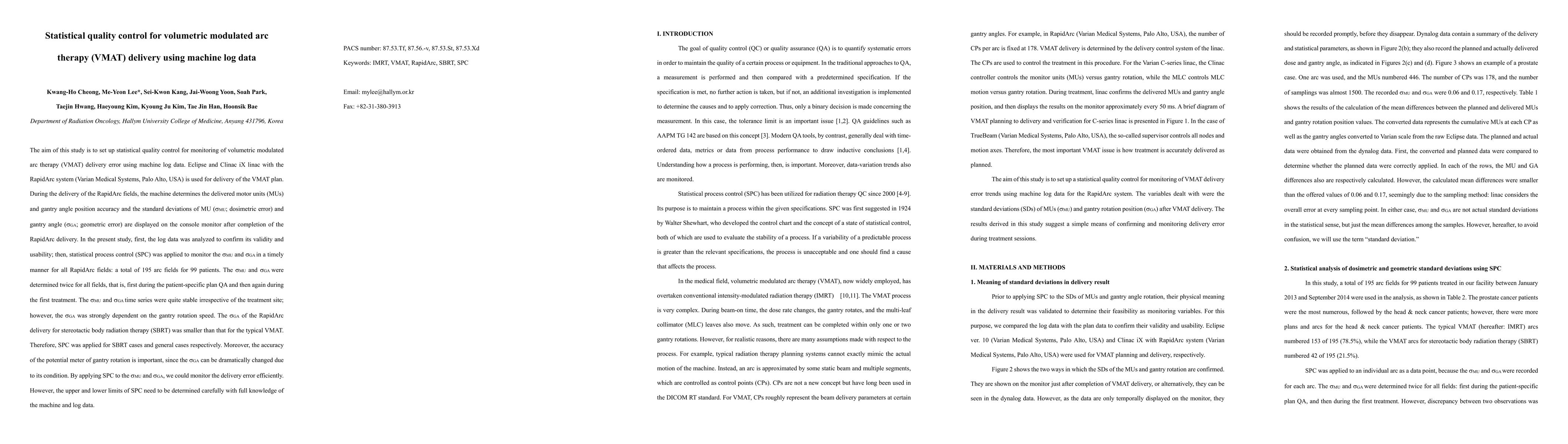 This study establishes statistical quality control for monitoring volumetric modulated arc therapy (VMAT) delivery errors using machine log data. It applies statistical process control (SPC) to monitor dosimetric and geometric errors, finding that while errors are stable, gantry angle accuracy is highly dependent on rotation speed, necessitating separate SPC for stereotactic body radiation therapy (SBRT) and general VMAT cases.