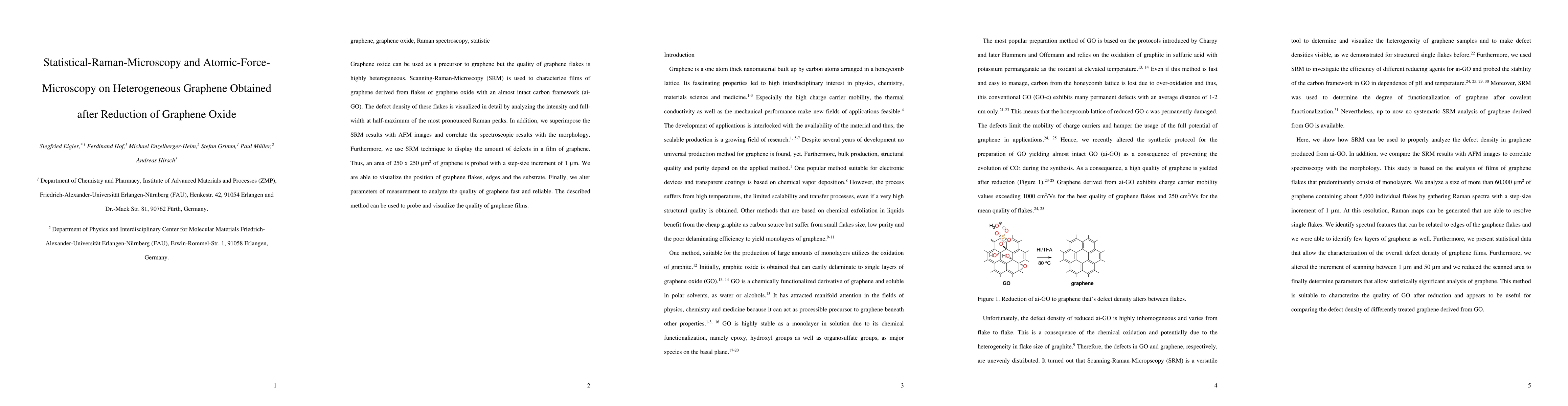 Graphene oxide can be used as a precursor to graphene but the quality of graphene flakes is highly heterogeneous. Scanning-Raman-Microscopy (SRM) is used to characterize films of graphene derived from flakes of graphene oxide with an almost intact carbon framework (ai-GO). The defect density of these flakes is visualized in detail by analyzing the intensity and full-width at half-maximum of the most pronounced Raman peaks. In addition, we superimpose the SRM results with AFM images and correlate the spectroscopic results with the morphology. Furthermore, we use SRM technique to display the amount of defects in a film of graphene. Thus, an area of 250 x 250 {\my}m2 of graphene is probed with a step-size increment of 1 {\mu}m. We are able to visualize the position of graphene flakes, edges and the substrate. Finally, we alter parameters of measurement to analyze the quality of graphene fast and reliable. The described method can be used to probe and visualize the quality of graphene films.