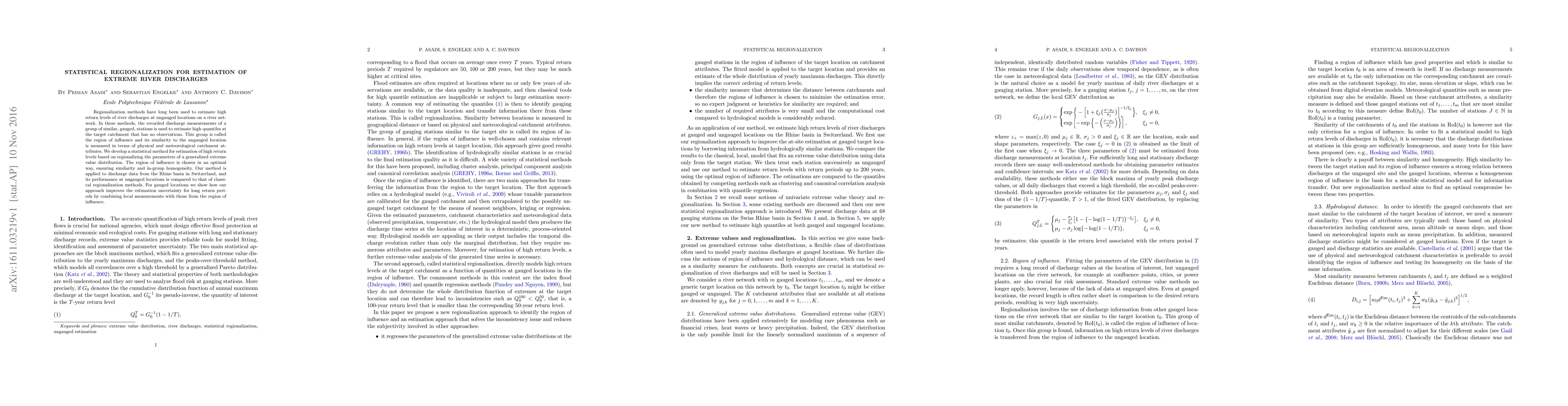 This paper develops a statistical method for estimating extreme river discharges at ungauged locations using regionalization, optimizing the selection of similar gauged stations based on physical and meteorological attributes. The method is tested on the Rhine basin in Switzerland, showing improved estimation uncertainty for long return periods compared to classical methods.