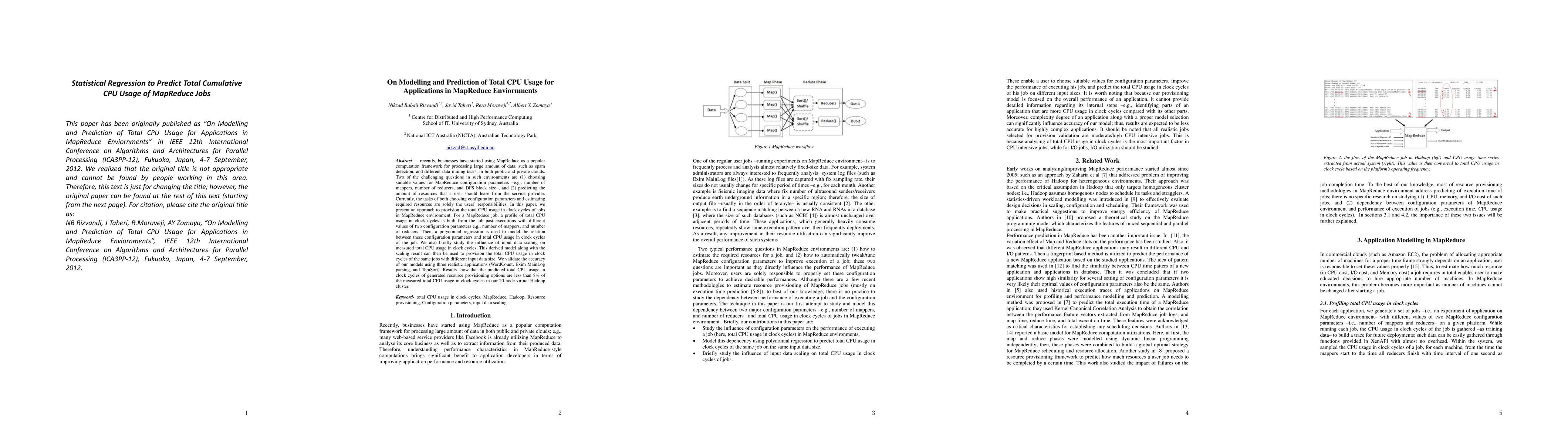 This paper proposes a statistical regression approach to predict the total cumulative CPU usage of MapReduce jobs based on configuration parameters and input data size. The authors use polynomial regression to model the relationship between parameters like the number of mappers and reducers, and CPU usage, validated by three applications with an error margin of less than 8% in a 20-node Hadoop cluster.