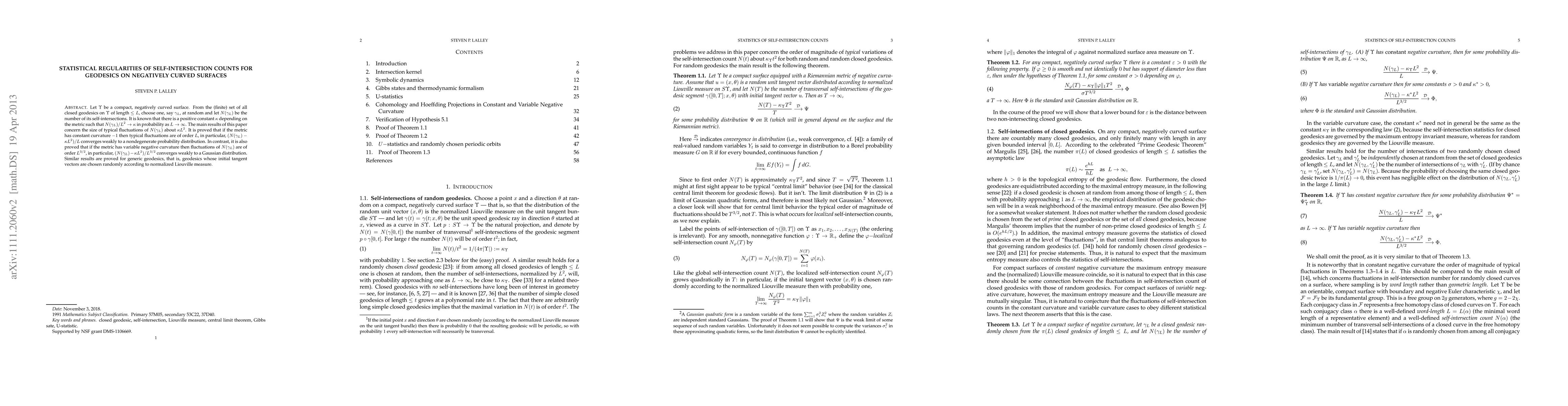 This paper investigates the statistical behavior of self-intersection counts for geodesics on negatively curved surfaces, proving that typical fluctuations are of order $L$ for constant curvature and $L^{3/2}$ for variable curvature. It also shows weak convergence to nondegenerate and Gaussian distributions, respectively.