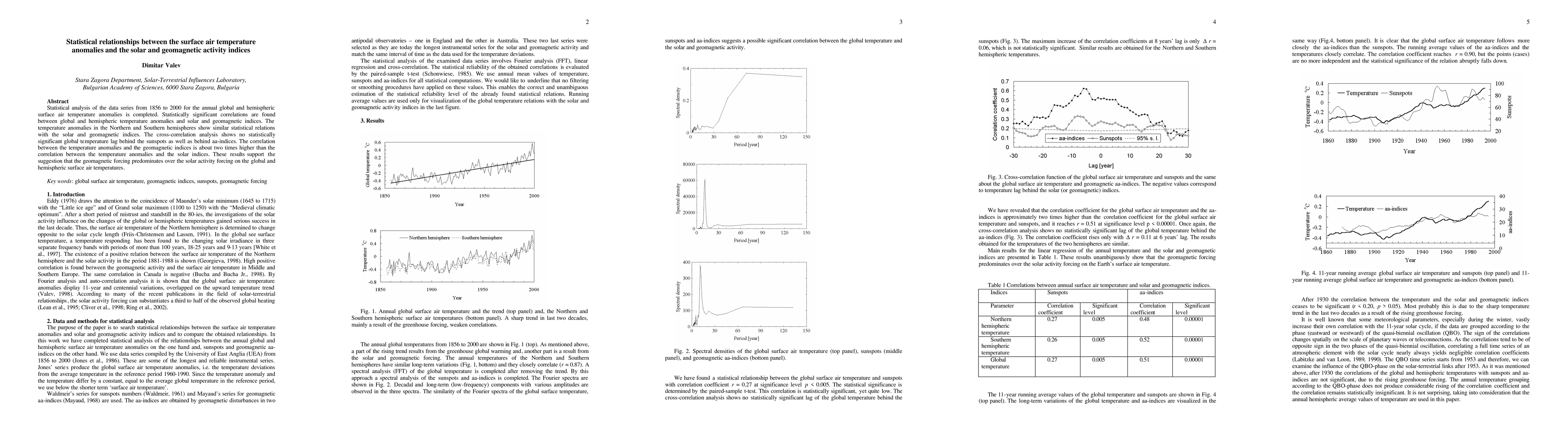 This study investigates statistical correlations between surface air temperature anomalies and solar and geomagnetic activity indices from 1856 to 2000. It finds significant links between temperature anomalies and geomagnetic indices, with twice the correlation strength compared to solar indices, suggesting geomagnetic forcing has a stronger influence on global and hemispheric temperatures.