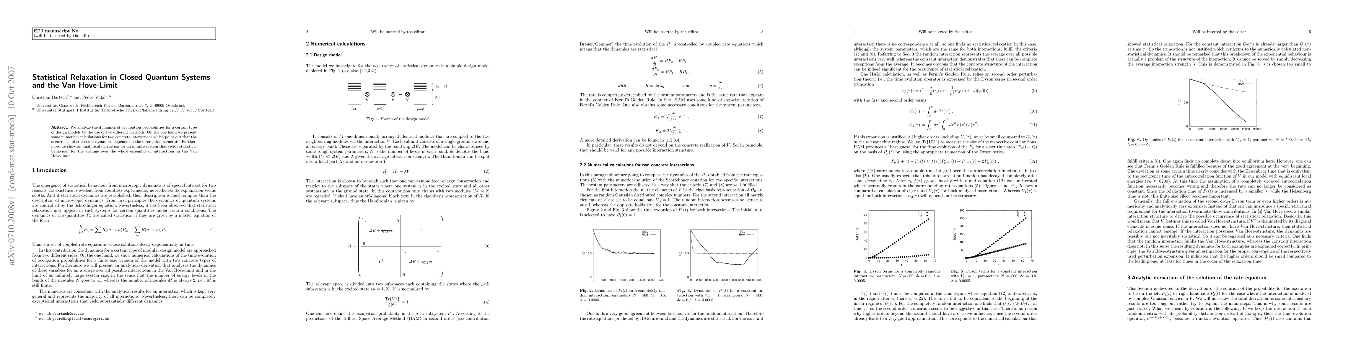 This paper investigates statistical relaxation in closed quantum systems, showing that it depends on interaction structure, with analytical results supporting the Van Hove-limit for infinite systems.