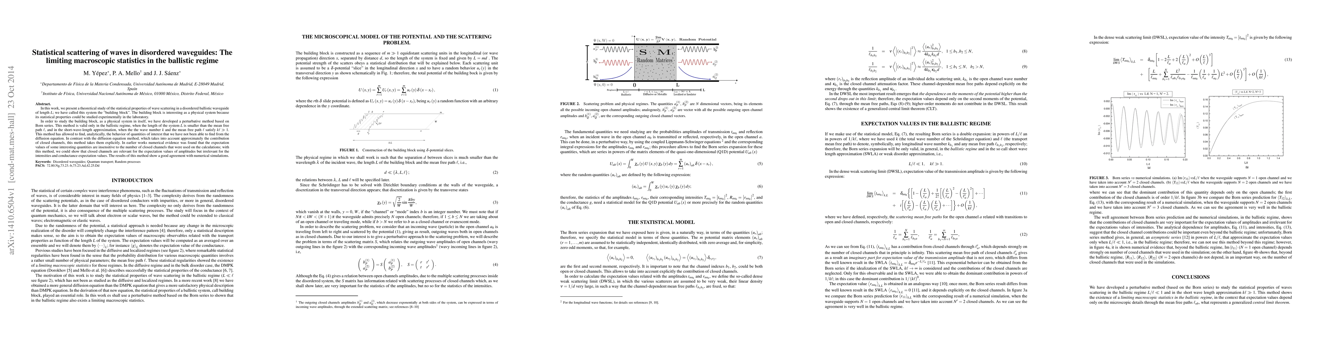 In this work, we present a theoretical study of the statistical properties of wave scattering in a disordered ballistic waveguide of length L; we have called this system the "building block". The building block is interesting as a physical system because its statistical properties could be studied experimentally in the laboratory. In order to study the building block, as a physical system in itself, we have developed a perturbative method based on Born series. This method is valid only in the ballistic regime, when the length of the system L is smaller than the mean free path l, and in the short-wave-length approximation, when the the wave number k and the mean free path l satisfy kl >> 1. This method has allowed to find, analytically, the behavior of quantities of interest that we have not been able to find from the diffusion equation. In contrast with the diffusion equation method, which takes into account approximately the contribution of closed channels, this method takes them explicitly. In earlier works numerical evidence was found that the expectation values of some interesting quantities are insensitive to the number of closed channels that were used on the calculations; with this method, we could show that closed channels are relevant for the expectation values of amplitudes but irrelevant for the intensities and conductance expectation values. The results of this method show a good agreement with numerical simulations.