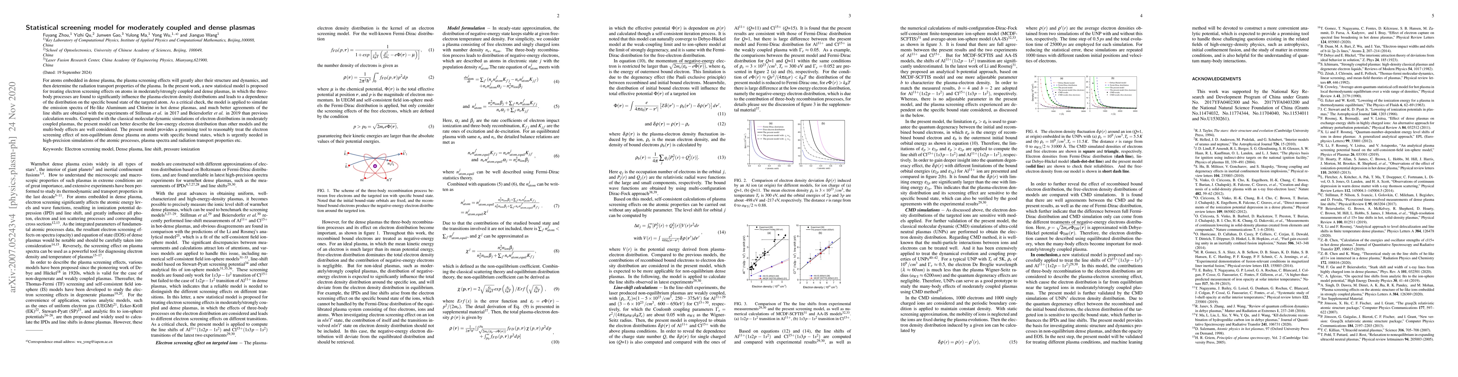 This paper proposes a new statistical screening model for moderately coupled and dense plasmas, emphasizing the influence of three-body processes on electron density distributions and their dependence on atomic bound states. The model demonstrates improved agreement with experimental data on He-like Aluminum and Chlorine spectra compared to previous methods.