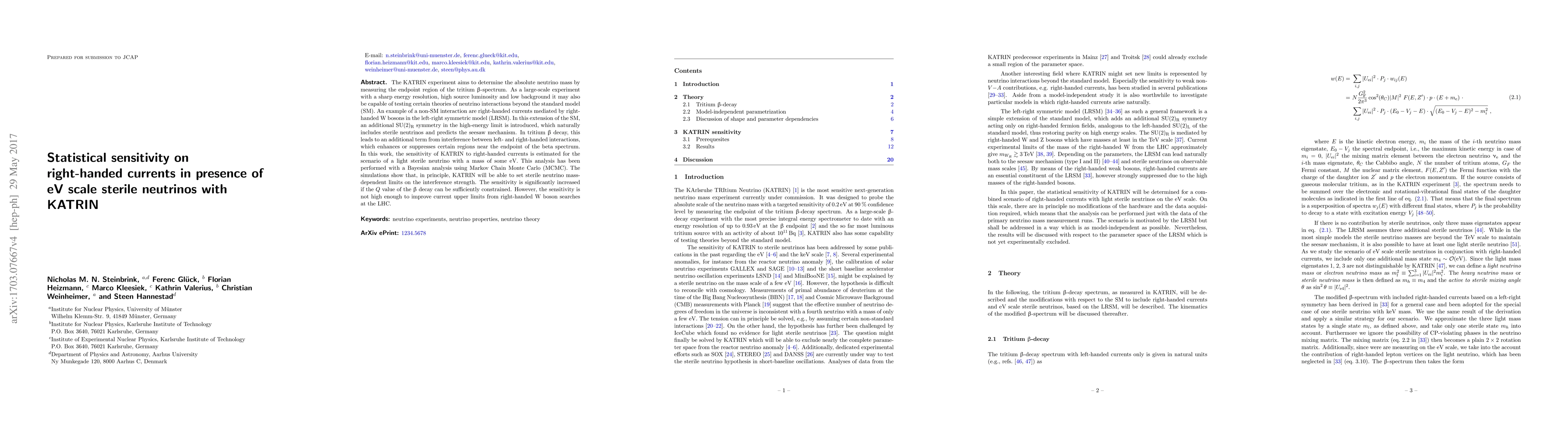 The KATRIN experiment aims to measure neutrino mass and may test beyond-standard-model interactions, such as right-handed currents. Bayesian analysis suggests KATRIN could set limits on sterile neutrino mass-dependent interference strengths, but its sensitivity does not yet surpass LHC limits on right-handed W bosons.