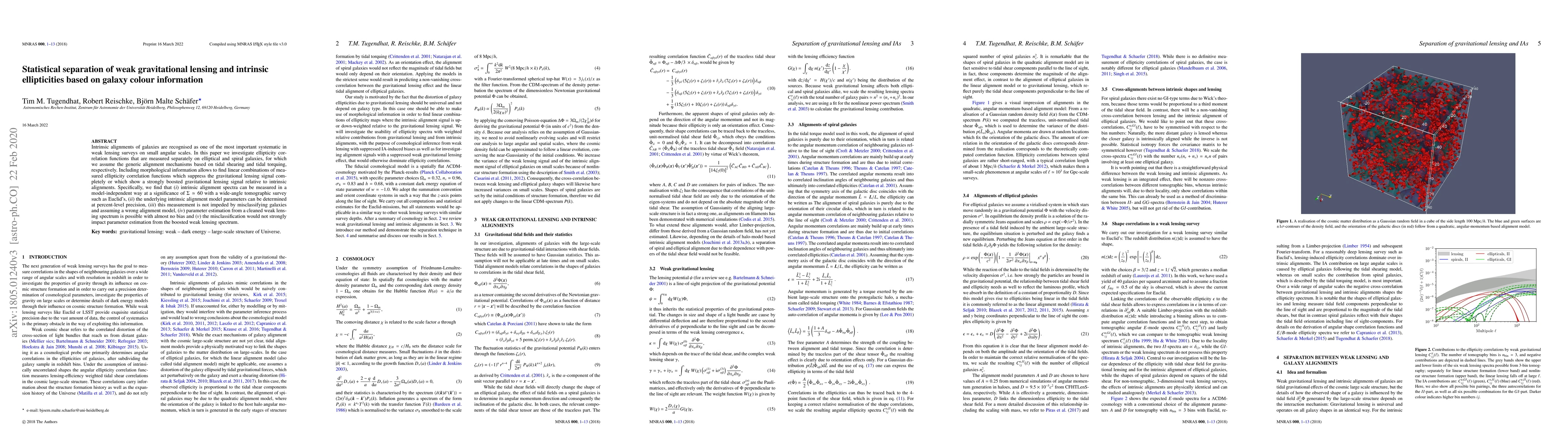 This paper proposes a method to statistically separate weak gravitational lensing from intrinsic ellipticities in galaxies using colour information, finding that morphological classification enhances the precision of intrinsic alignment measurements and allows for robust parameter estimation despite potential misclassifications.