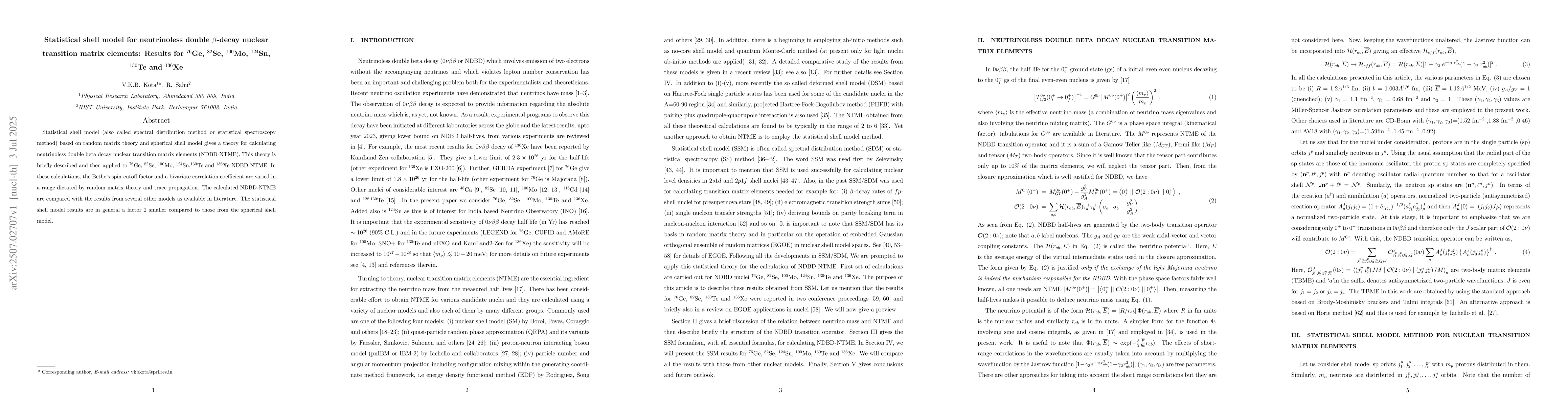 This paper presents a statistical shell model based on random matrix theory and spherical shell model for calculating neutrinoless double beta decay nuclear transition matrix elements (NDBD-NTME). Applied to $^{76}$Ge, $^{82}$Se, $^{100}$Mo, $^{124}$Sn, $^{130}$Te, and $^{136}$Xe, the model's results show NDBD-NTME values generally half those from the spherical shell model. The method varies Bethe's spin-cutoff factor and bivariate correlation coefficient within ranges guided by random matrix theory and trace propagation.