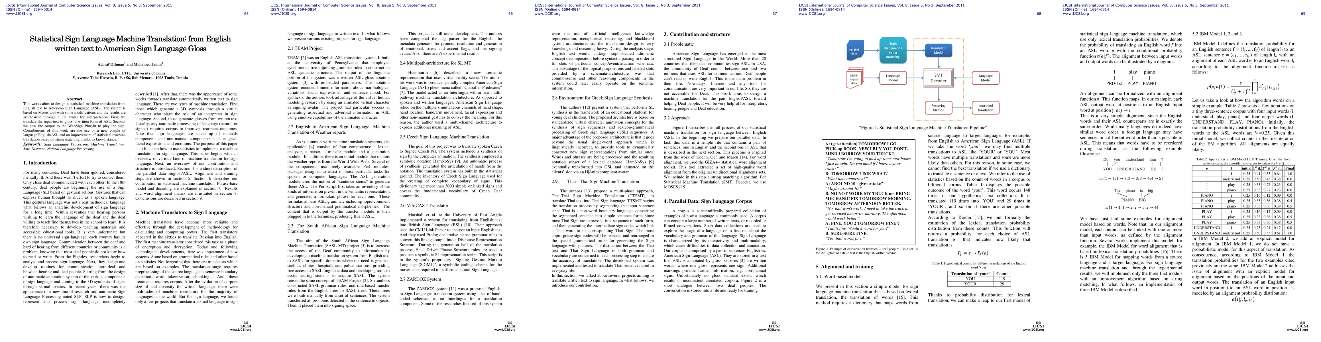 This paper presents a statistical machine translation system translating English text to American Sign Language (ASL) gloss, synthesized via a 3D avatar. It modifies the Moses tool and enhances translation accuracy using Jaro-distance for string matching.