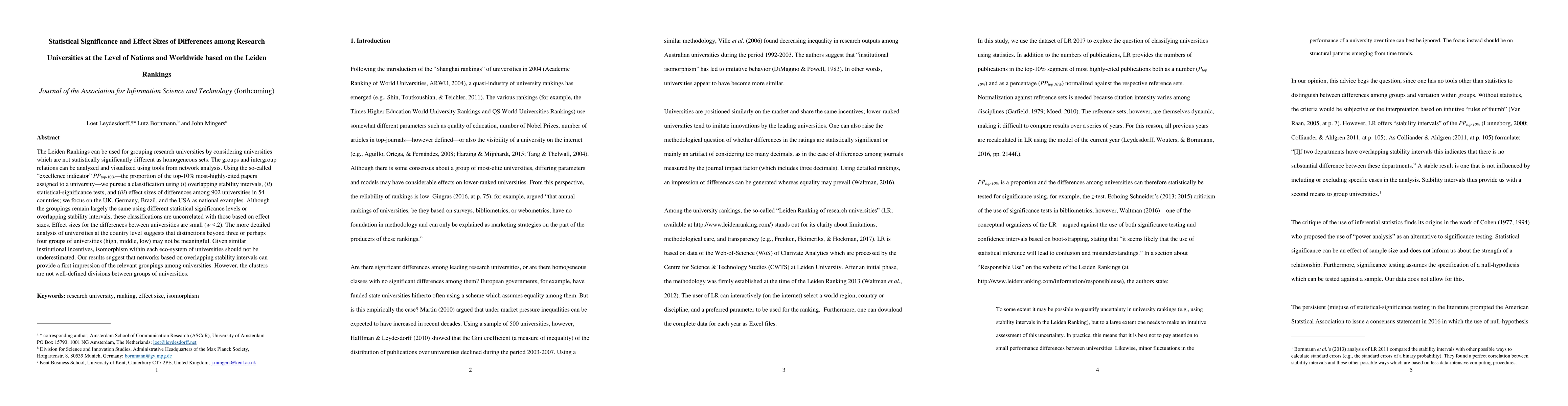 This study uses the Leiden Rankings to classify research universities based on the "excellence indicator" PPtop-10%, employing overlapping stability intervals, statistical significance tests, and effect sizes. The analysis reveals that while groupings remain consistent across different statistical methods, effect sizes indicate small differences among universities, suggesting that distinctions beyond three or four groups may not be meaningful.