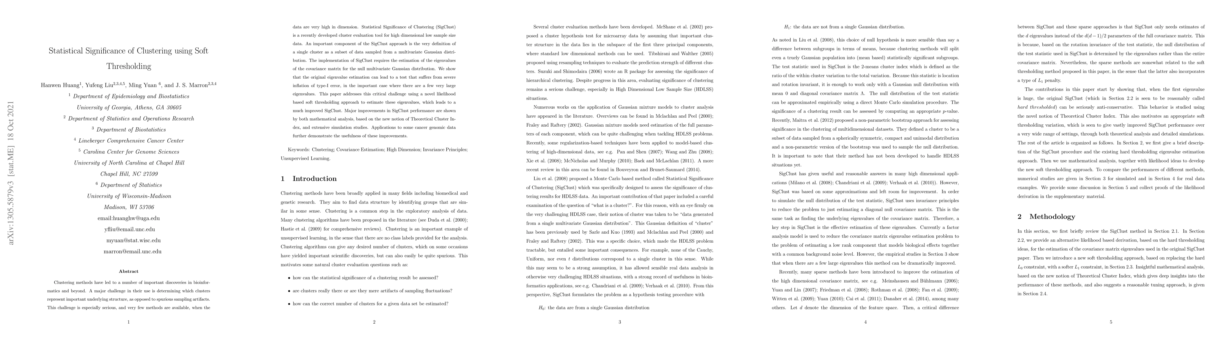 Clustering methods have led to a number of important discoveries in bioinformatics and beyond. A major challenge in their use is determining which clusters represent important underlying structure, as opposed to spurious sampling artifacts. This challenge is especially serious, and very few methods are available, when the data are very high in dimension. Statistical Significance of Clustering (SigClust) is a recently developed cluster evaluation tool for high dimensional low sample size data. An important component of the SigClust approach is the very definition of a single cluster as a subset of data sampled from a multivariate Gaussian distribution. The implementation of SigClust requires the estimation of the eigenvalues of the covariance matrix for the null multivariate Gaussian distribution. We show that the original eigenvalue estimation can lead to a test that suffers from severe inflation of type-I error, in the important case where there are a few very large eigenvalues. This paper addresses this critical challenge using a novel likelihood based soft thresholding approach to estimate these eigenvalues, which leads to a much improved SigClust. Major improvements in SigClust performance are shown by both mathematical analysis, based on the new notion of Theoretical Cluster Index, and extensive simulation studies. Applications to some cancer genomic data further demonstrate the usefulness of these improvements.