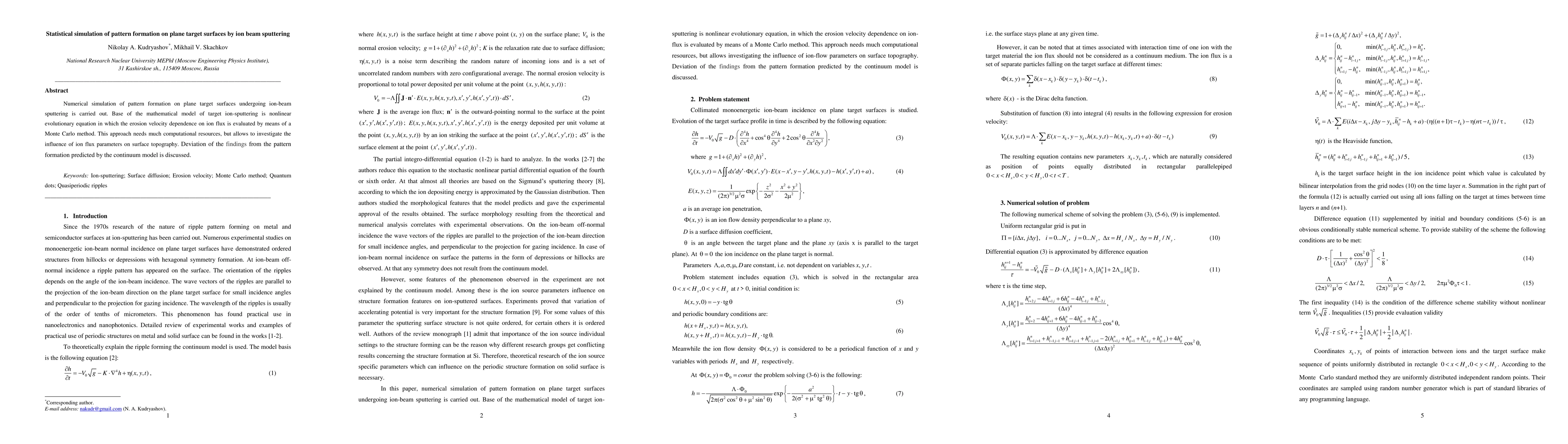 Numerical simulation of pattern formation on plane target surfaces undergoing ion-beam sputtering is carried out. Base of the mathematical model of target ion-sputtering is nonlinear evolutionary equation in which the erosion velocity dependence on ion flux is evaluated by means of a Monte Carlo method. This approach needs much computational resources, but allows to investigate the influence of ion flux parameters on surface topography. Deviation of the findings from the pattern formation predicted by the continuum model is discussed.