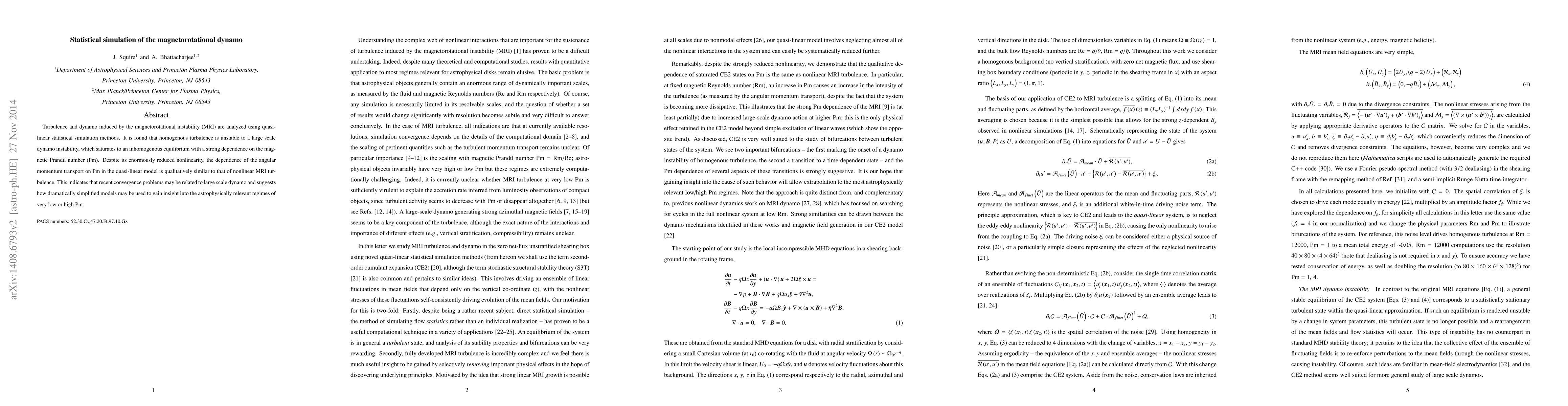 Turbulence and dynamo induced by the magnetorotational instability (MRI) are analyzed using quasi-linear statistical simulation methods. It is found that homogenous turbulence is unstable to a large scale dynamo instability, which saturates to an inhomogenous equilibrium with a strong dependence on the magnetic Prandtl number (Pm). Despite its enormously reduced nonlinearity, the dependence of the angular momentum transport on Pm in the quasi-linear model is qualitatively similar to that of nonlinear MRI turbulence. This indicates that recent convergence problems may be related to large scale dynamo and suggests how dramatically simplified models may be used to gain insight into the astrophysically relevant regimes of very low or high Pm.