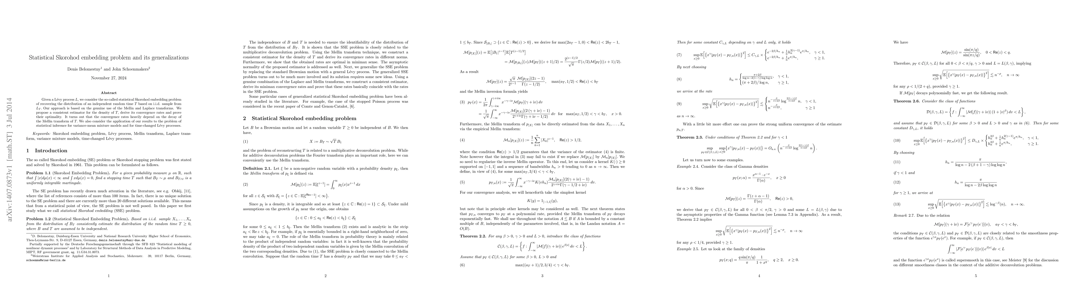 This paper addresses the statistical Skorohod embedding problem for L\'evy processes, proposing a consistent estimator for the density of an independent random time $T$ using Mellin and Laplace transforms. The authors derive convergence rates and prove their optimality, highlighting the dependence on the decay of the Mellin transform of $T$, and extend the results to infer variance-mean mixture models and time-changed L\'evy processes.