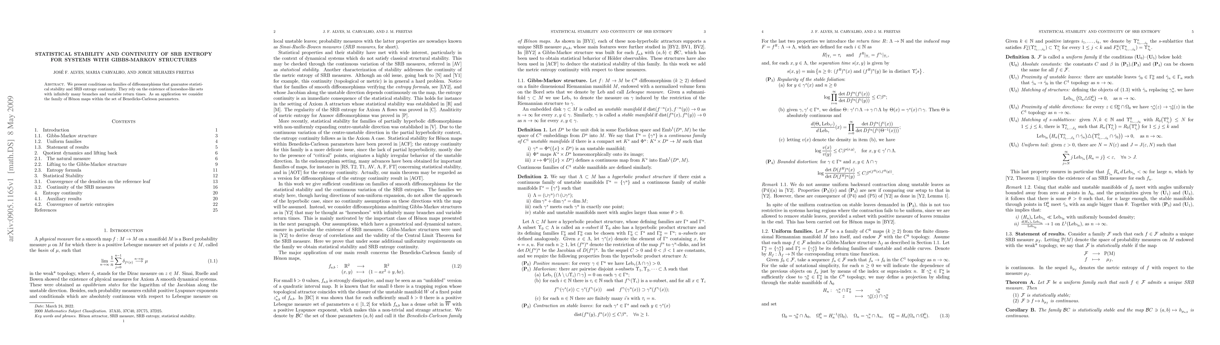 This paper establishes conditions ensuring statistical stability and continuity of SRB entropy for systems with Gibbs-Markov structures, focusing on the presence of horseshoe-like sets with multiple branches and variable return times. An application to Henon maps under Benedicks-Carleson parameters is provided.