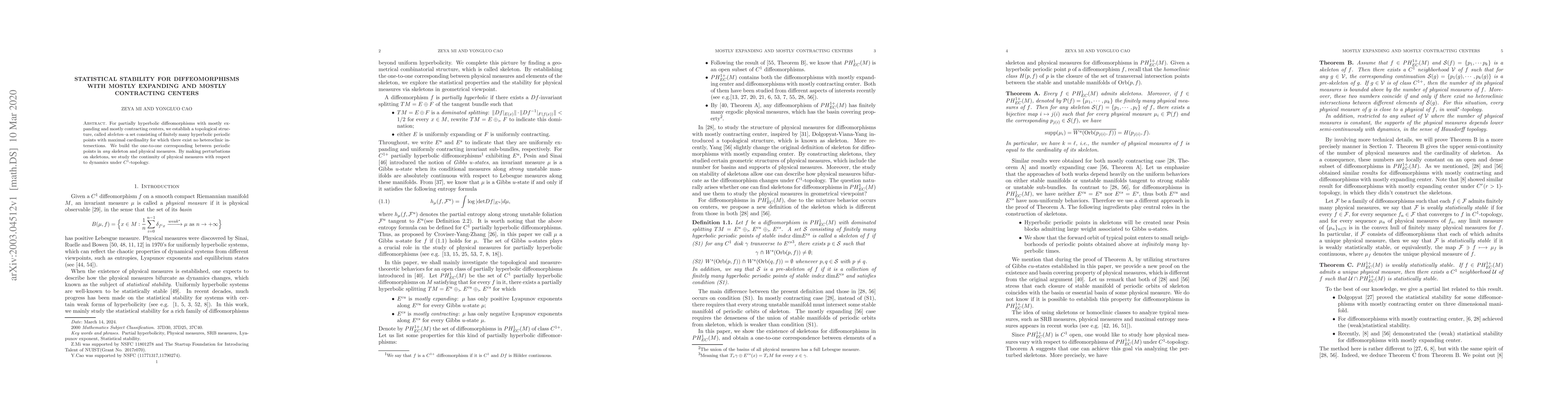 For partially hyperbolic diffeomorphisms with mostly expanding and mostly contracting centers, we establish a topological structure, called skeleton{a set consisting of finitely many hyperbolic periodic points with maximal cardinality for which there exist no heteroclinic intersections. We build the one-to-one corresponding between periodic points in any skeleton and physical measures. By making perturbations on skeletons, we study the continuity of physical measures with respect to dynamics under $C^1$-topology.